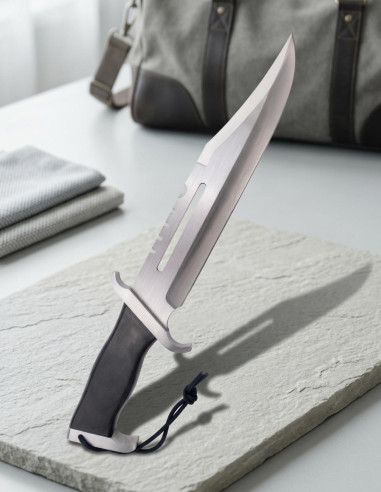 The blade is approximately 4.5" long and approximately 1/8" thick, making it perfect for a wide variety of outdoor tasks, from chopping firewood to preparing food. In addition, the rivets on the handle and the distinctive notch on the back of the blade underline the resistant and functional character of the knife.