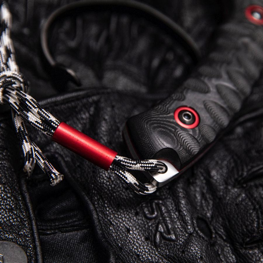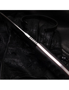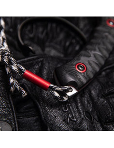 The handle, made of black micarta, provides a secure grip thanks to its special texturing. The red details are not just an aesthetic touch; they also optimize the handling experience, ensuring the knife feels firm in your hand even in the most demanding situations.