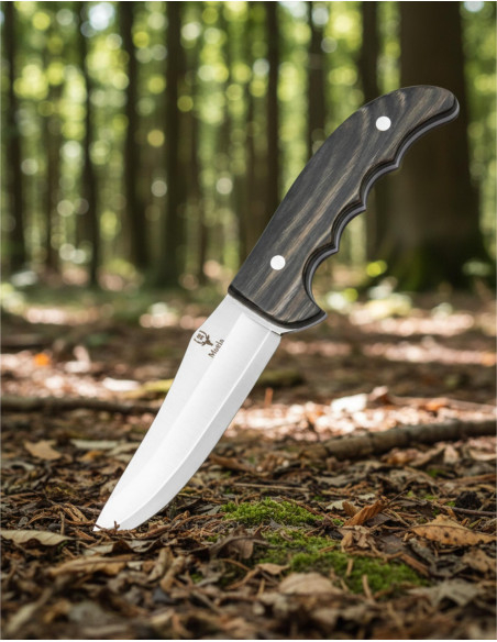 The handle, made of pressed evergreen wood with visible grains and a smooth finish, is designed to fit comfortably in the hand. The finger grooves and the final curve allow for a firm and comfortable grip, reducing fatigue during prolonged work and enhancing safety in demanding cuts. The metal rivets reinforce the union between the blade and the handle, instilling confidence from the first grip.