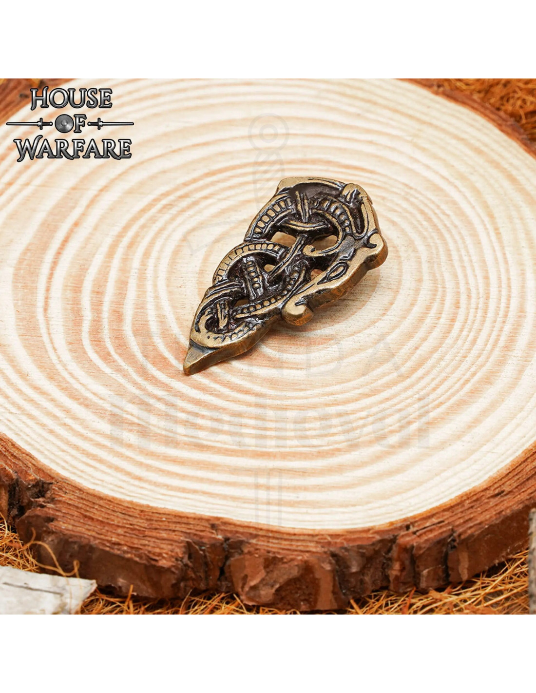 The Viking belt tip in antique brass provides a dark golden finish that enhances any belt, effortlessly giving an air of authenticity. Its intertwined design, with reliefs depicting knots and the silhouette of a mythical animal, draws attention and sparks curiosity, making you the center of conversation both in a historical reenactment and an informal outing.