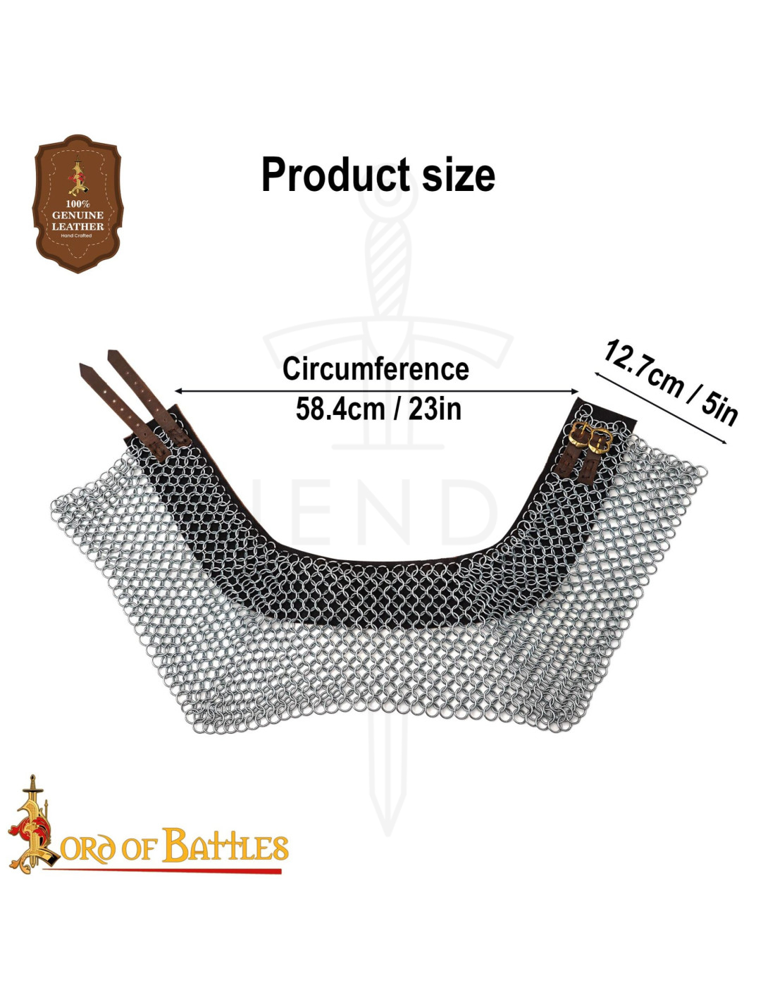 The Medieval Steel Mesh Gorget with Leather combines a network of handcrafted metal rings with a leather-lined collar, resulting in protection that conforms and falls naturally over the shoulders and chest. This flexibility facilitates head and shoulder movement without creating uncomfortable pressure points, while the high-strength construction ensures durability against abrasions and minor impacts.