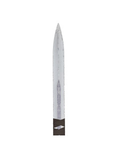 With a design that evokes elegance and strength, the steel blade features a shiny finish that spectacularly captures light, while the decorative engravings add a touch of sophistication. Every detail has been carefully considered, from the handle adorned with a brown ribbon that provides a comfortable grip, to the handguard that complements its classic aesthetic.