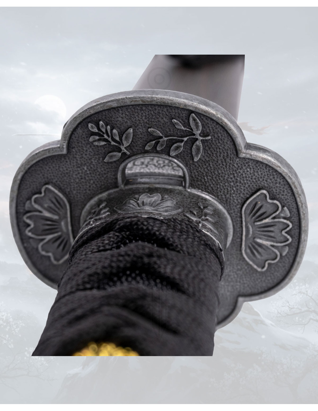 The handle, wrapped in intertwined black fabric, ensures a secure and comfortable grip, designed for smooth handling. The golden symbols present on the wrapping add a touch of distinction, creating contrast and personality without losing the sobriety of the whole. The dark-toned guard, with embossed engravings and simple design, frames the piece with discretion and character.