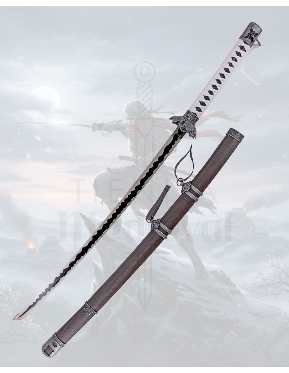The white wrapped handle, with the classic dark diamond-shaped weaving, not only recalls tradition but also improves grip, keeping the sword stable in hand during its display. The tsuba with floral design adds an ornamental and distinctive touch, turning each glance into a visual discovery.