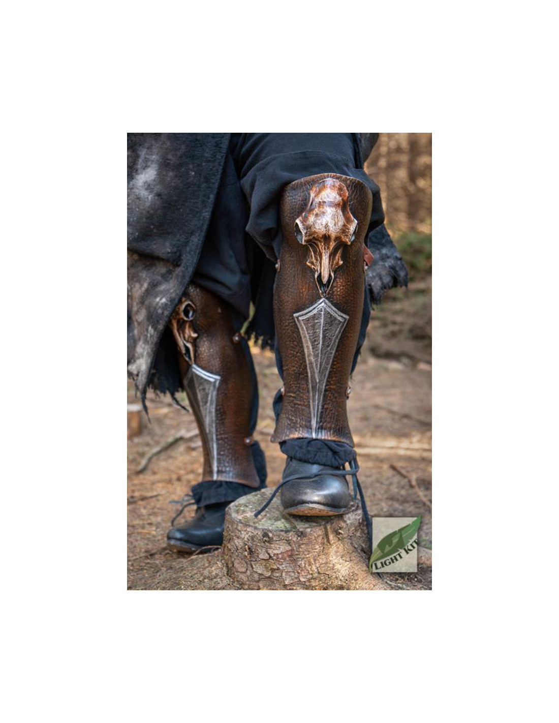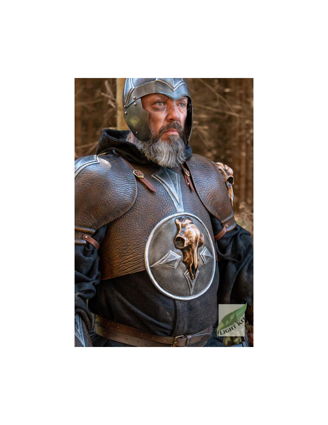 This complete kit of high fantasy armor includes a helmet, breastplate, shoulder pads, bracers, and greaves. Each piece is made of rigid foam, which guarantees its durability and resistance in combat. But not only that, the barbarian armor from Epic Armory is a work of art in itself. Fashioned to resemble a dark brown leather animal skin decorated with steel plates, this armor stands out with its imposing and authentic appearance.