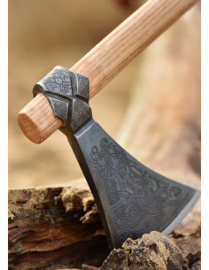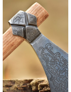 However, it is important to note that this piece is not a battle-ready weapon. Its beauty and authenticity make it a perfect item to display or decorate your home, making it a true treasure for lovers of Viking history. The ax head, made of high carbon steel, has a 10 cm long blunt edge, making it a safe object to handle.