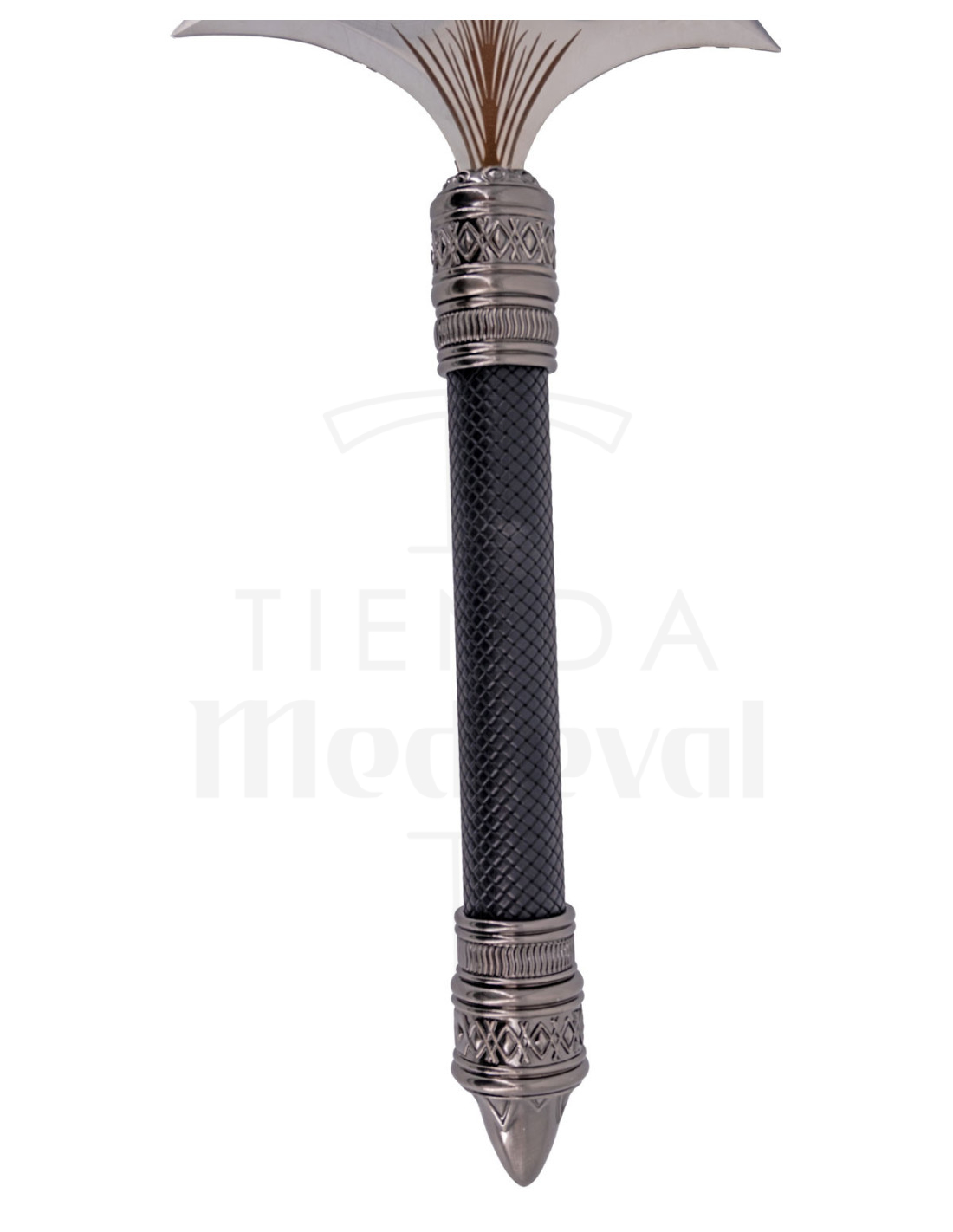 The metallic fittings with bas-relief, present at both ends of the handle, add an ornamental point that harmonizes with the overall aesthetics, while the conical termination at the base adds a contrast that balances design and presence. It is a perfect alternative for collectors who value items with personality, or for decorators looking for a distinct accent in themed environments.