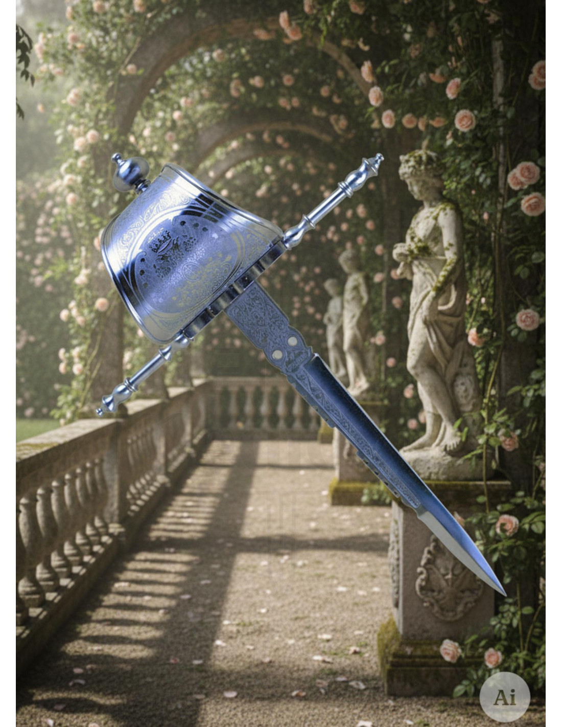 Discover the Left Hand Dagger with sheath, an exceptional piece for collectors! This dagger has been handcrafted in Toledo, Spain, with meticulous attention to detail. Its engraved steel blade and bowl give it a unique and elegant appearance.