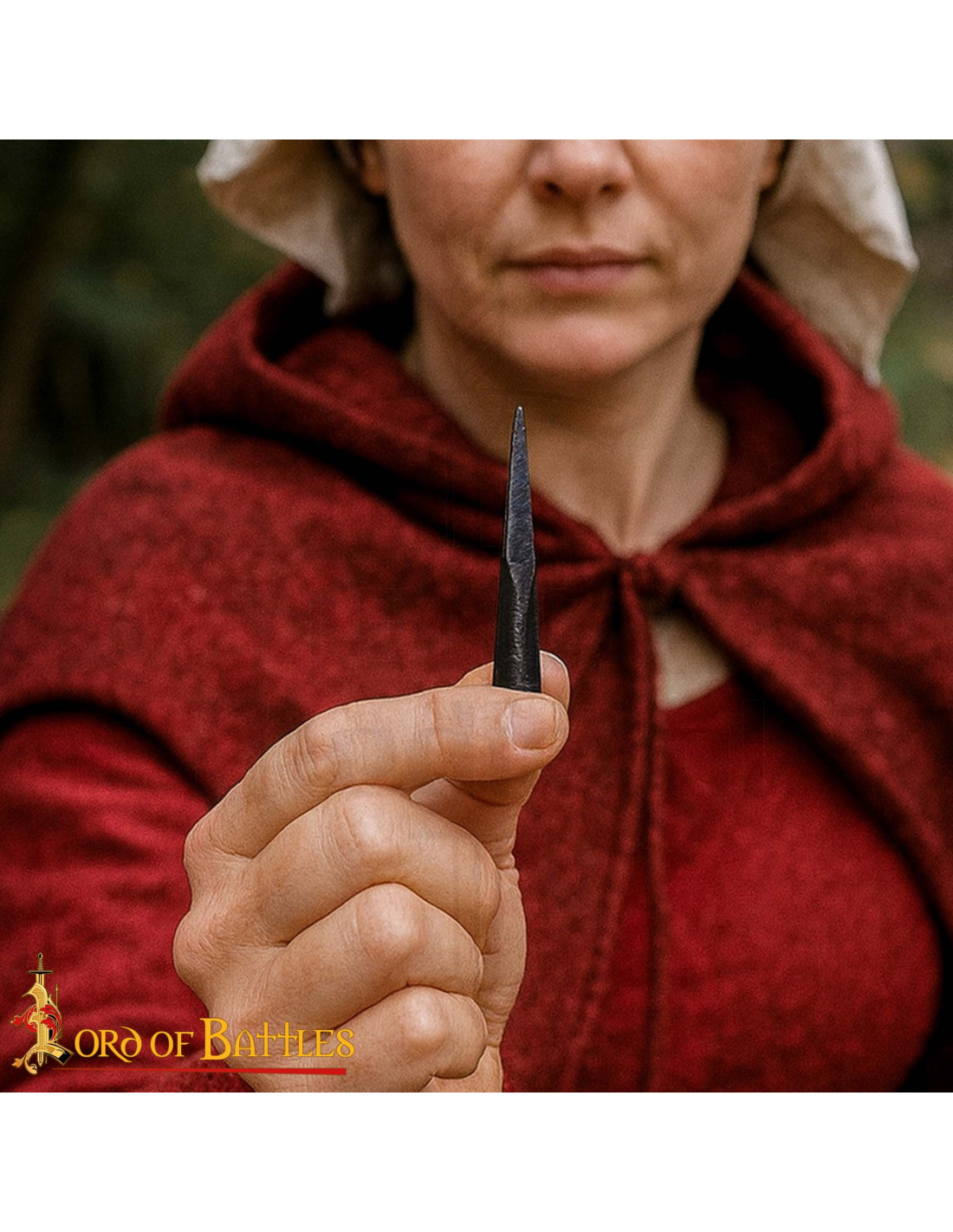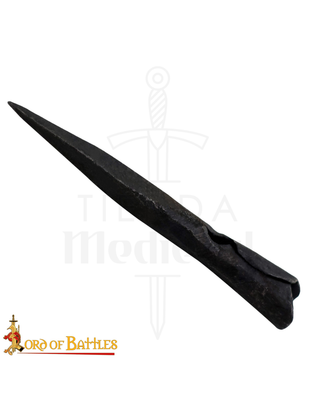 The narrow and conical shape of this point directs all energy towards a precise spot, enhancing penetration and providing a realistic feel when embedding it in a display piece or mounting it on a staff for presentation. Hand-forged in iron, it offers a robust and authentic appearance that enhances any display or themed corner.
