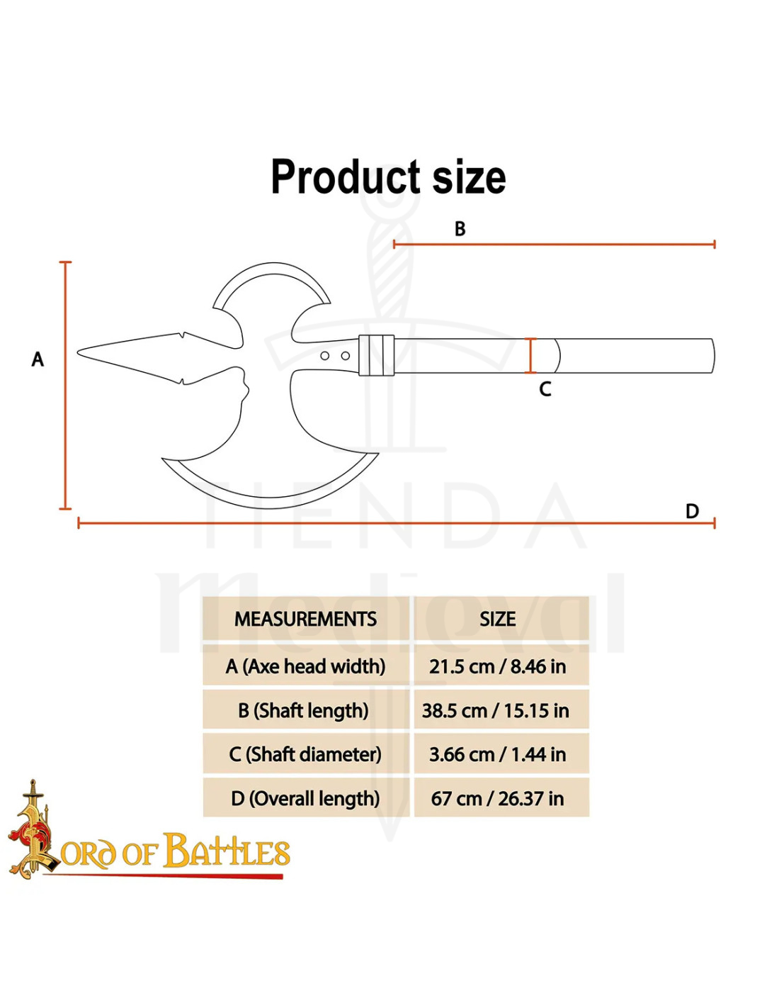 The reinforced union between the head and shaft offers stability, improving responsiveness in every technique, while the compact size facilitates fluid and agile strikes without sacrificing strength or presence. If you want to buy the Medieval Carbon Steel Axe Model Halberd for a collection with character, a historical representation, or a show, this piece combines aesthetics and functionality.