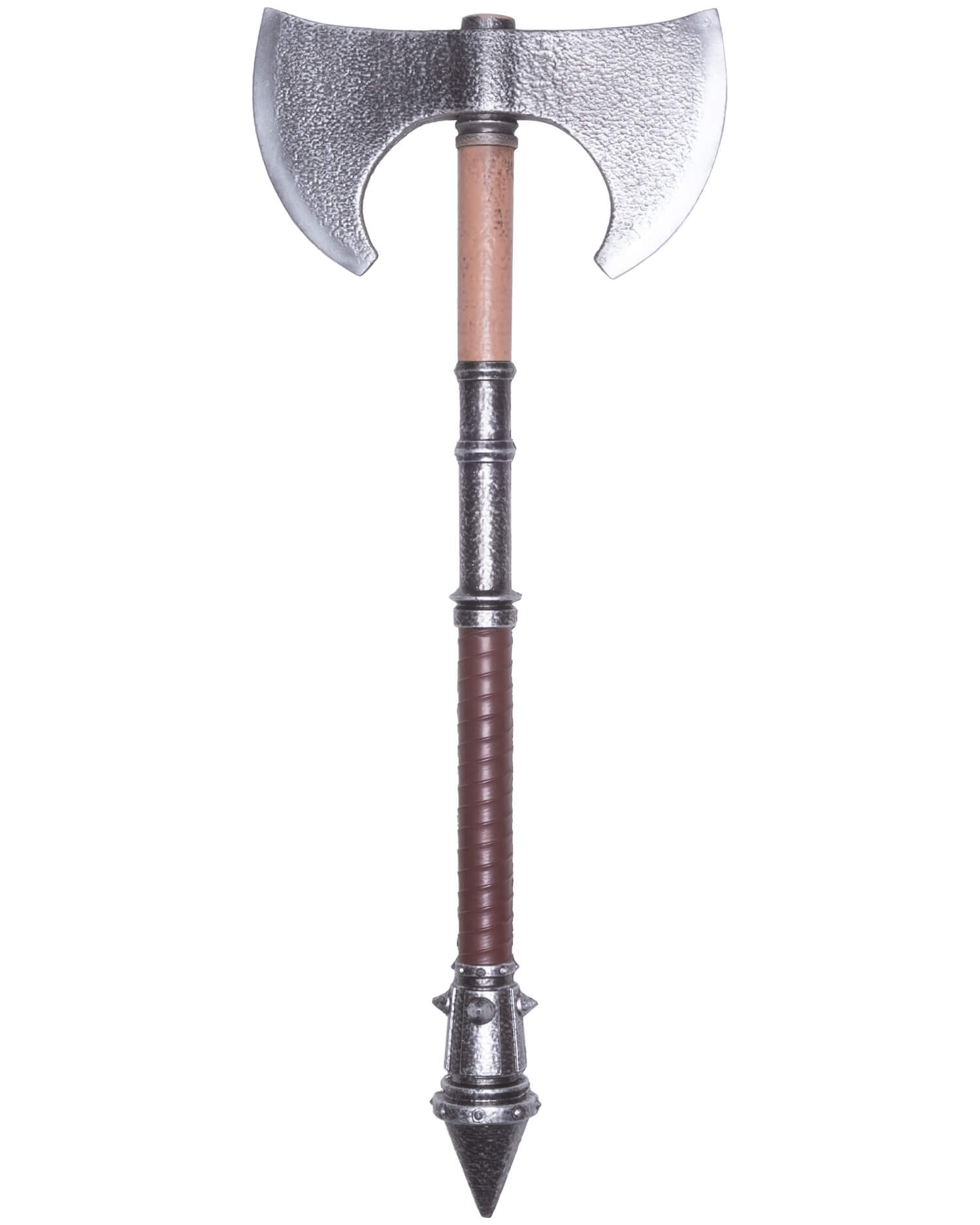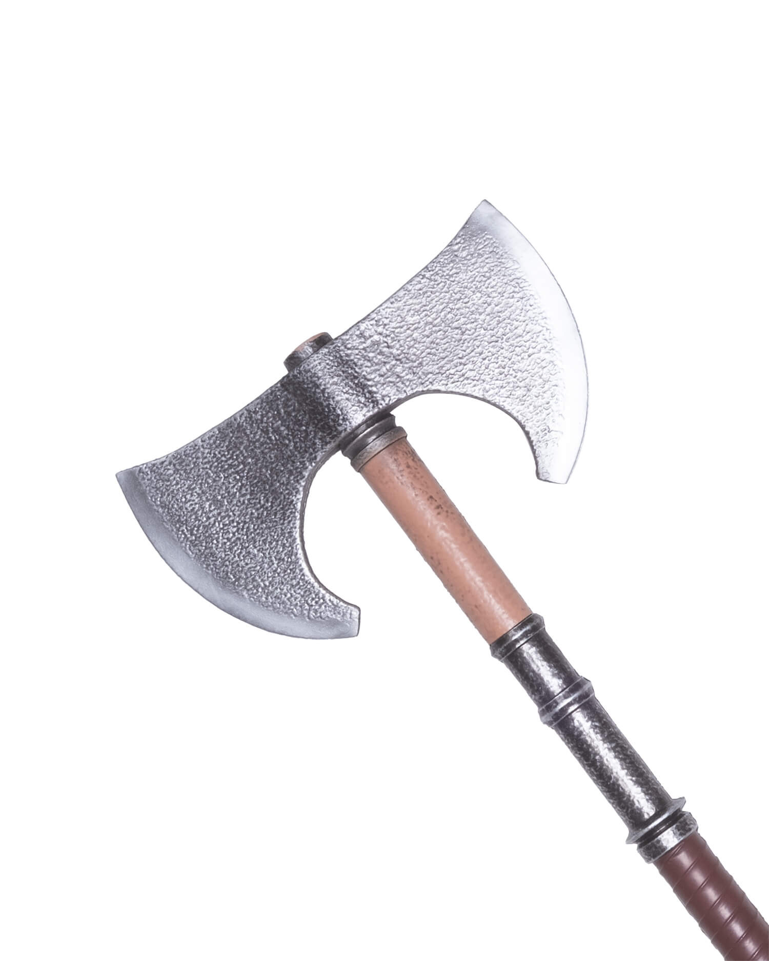 The symmetrical double blade, with a hammered texture reminiscent of ancient metalwork, offers an authentic look that complements barbarian, dwarf, or northern characters, while its compact silhouette facilitates quick movements and precise maneuvers in scenic combat. The handle features distinct sections — a lighter wood-tone upper section, a central rough-finish segment that matches the blade, and a lower grip wrapped in a ribbed pattern — all designed to provide a secure grip and constant control during long battles.