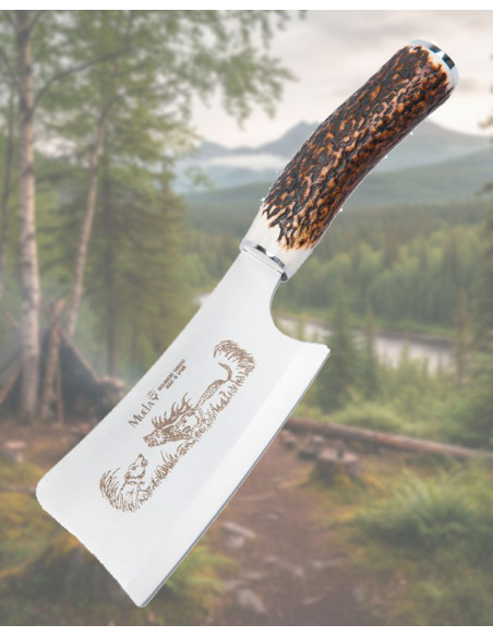 The deer antler handle retains its natural texture and grains, offering a warm feel and a firm grip. Its slightly curved shape fits comfortably in the hand, facilitating control and reducing fatigue during extended use. The metal piece between the blade and the handle reinforces the union, providing a sense of solidity and security with every movement.