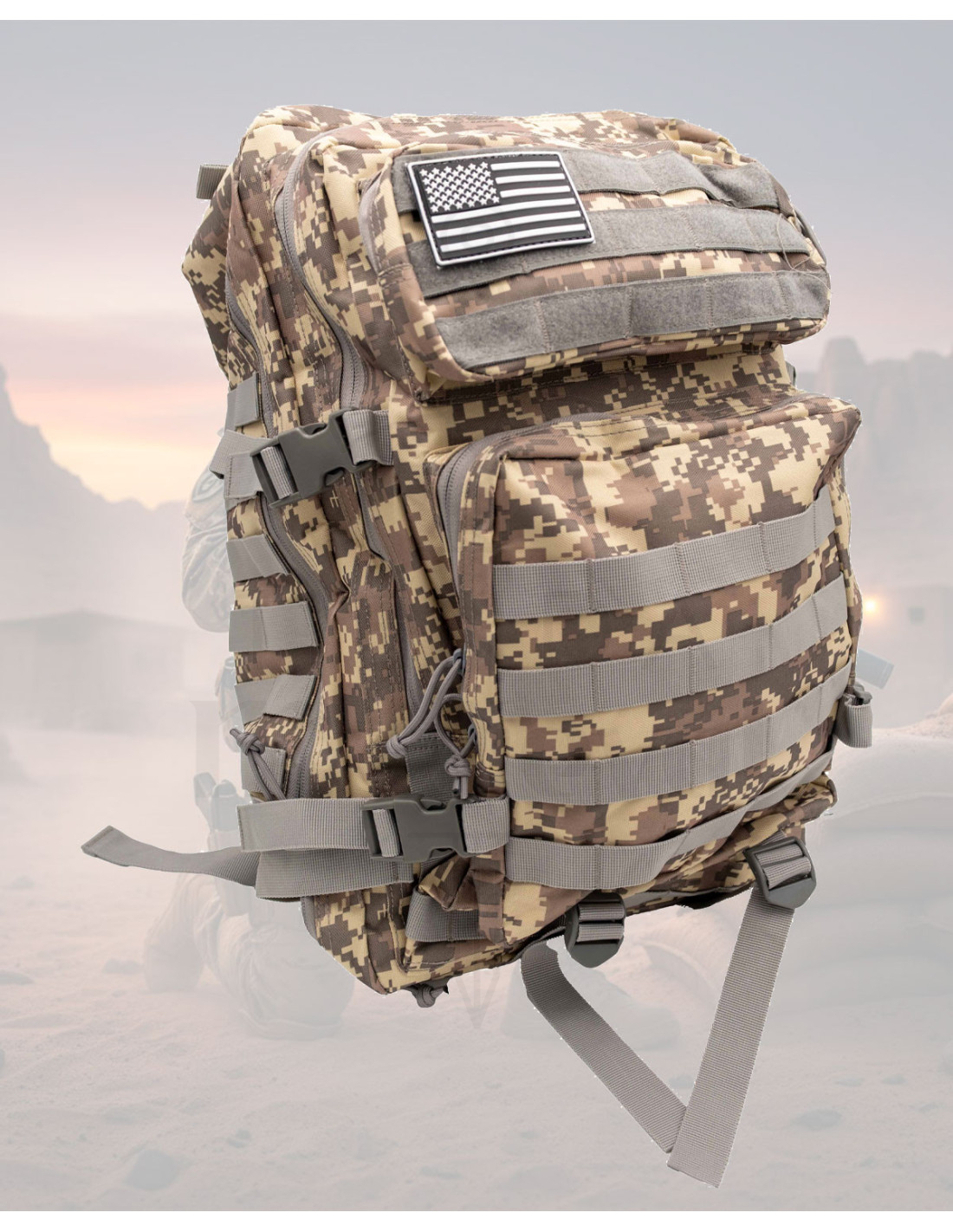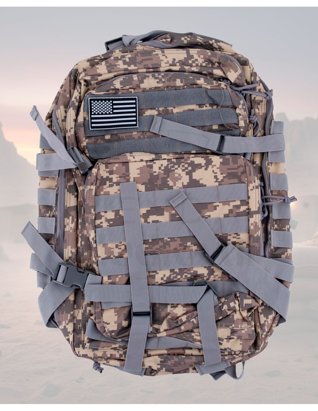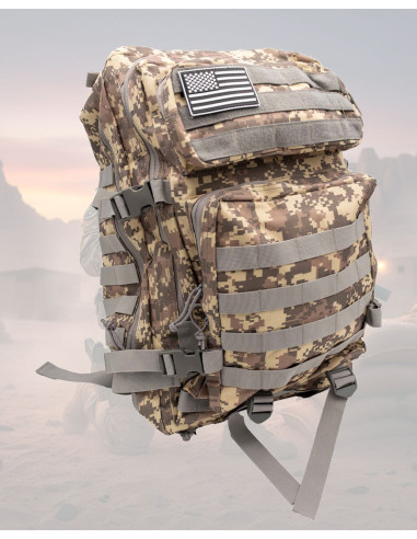 The Tactical Backpack 35-40L Digital Camo with MOLLE System is designed for those who seek durability and organization on every outing. Its camo pattern in brown and beige tones not only provides a discreet and sturdy appearance but also helps it blend into natural settings without drawing attention. The 600D nylon and the interior lining with foam and polyester offer a solid feel that protects the contents and withstands tough use.