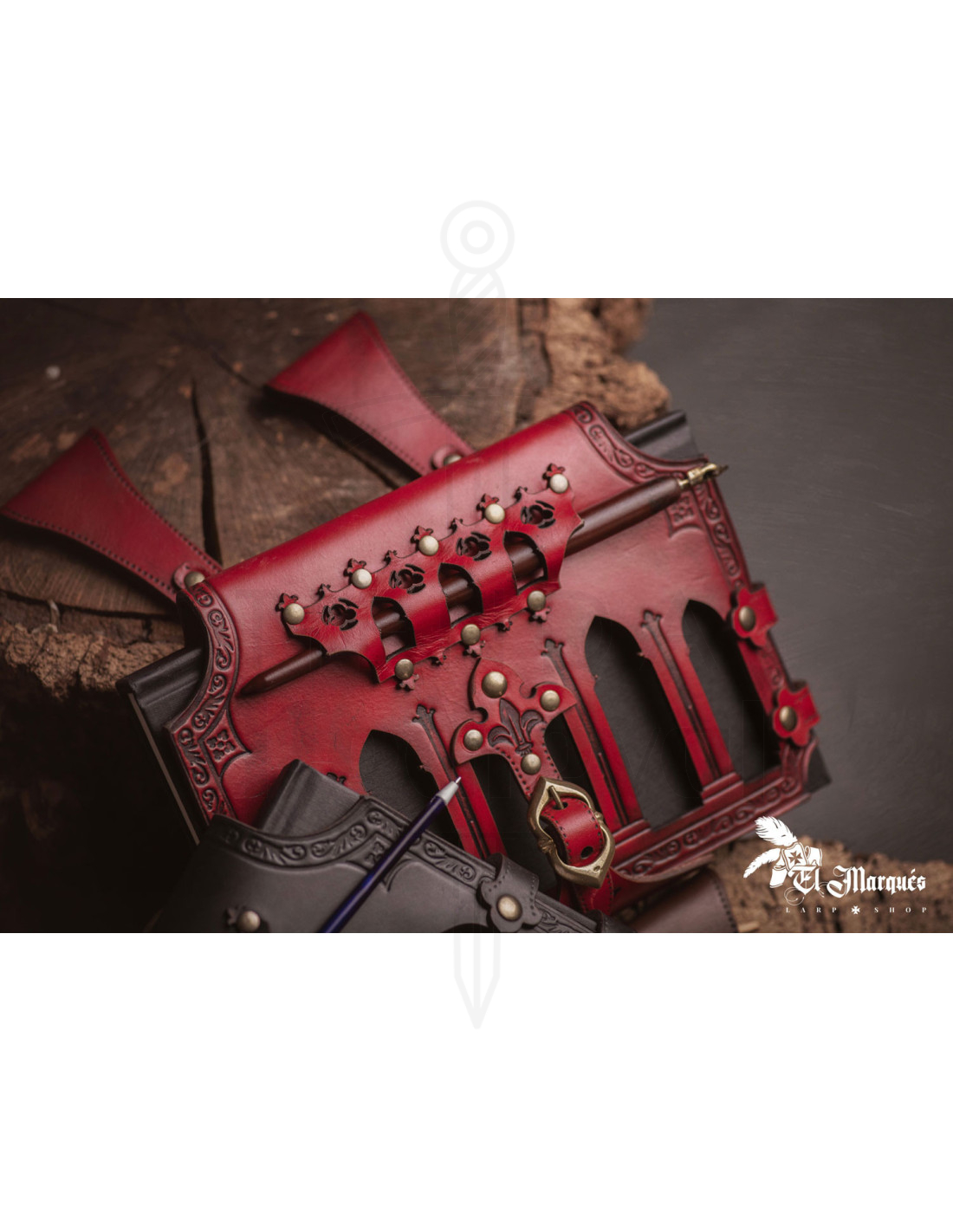 Designed for those who write and travel, the medieval Book Portal Guardian of Thoughts model accompanies your notes with style and functionality, protecting what you value most without sacrificing a refined appearance. Its front window allows you to see and recognize the notebook without opening it, so you can quickly access ideas and maps, while decorative engravings and metal rivets provide an authentic presence that blends with costumes for historical reenactment, role-playing events, or everyday use.