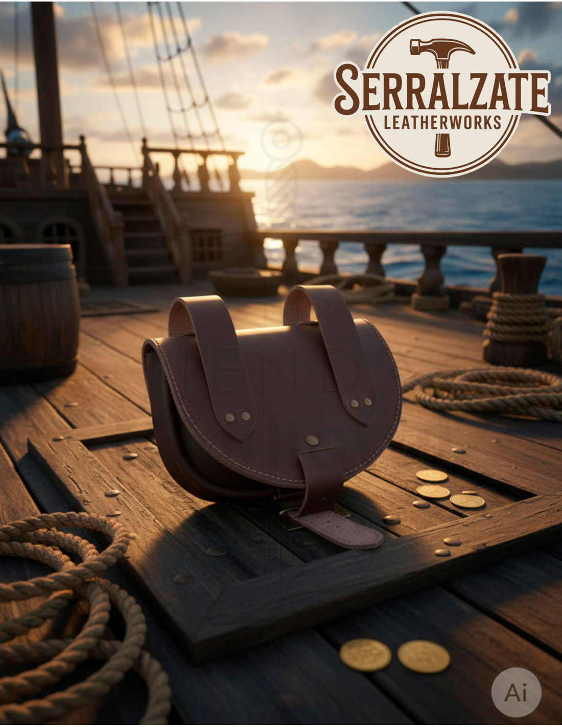 More than just an accessory, it's a practical solution to carry the essentials without sacrificing style: its compact size allows for free movement, the buckle closure facilitates quick and secure access, and the attachment to the belt keeps your hands free while still keeping the piece visible as a symbol of identity. It pairs well with the pirate hat, creating a coordinated look for those who seek aesthetic coherence.