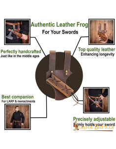 It is meticulously handcrafted from durable TOP GRAIN LEATHER. The stand has adjustable ropes for variable weapon widths (for different swords and axes). The loops are attached to the frog with antique brass rivets that can easily fit a 10cm wide belt. Its dimensions are approx. (25 X 14) cm.