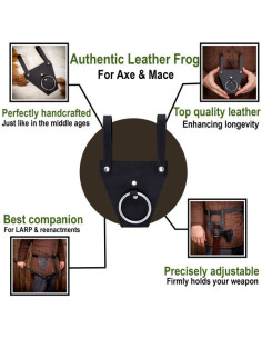 Constructed with leather handles and attached using nickel plated mild steel rivets, the frog offers great holding power and comfort. Its steel ring, also coated with nickel, has a diameter of approximately 2 inches, thus ensuring the stability of your axes or daggers.