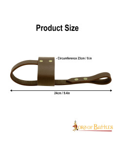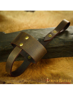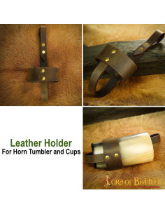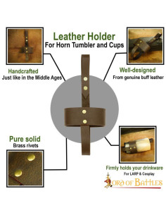 Hanging right next to your mighty axe is this leather holder, dangling from your warrior belt, holding your favorite horn cup or even your glass. The loops are firmly riveted together to support a robust construction.