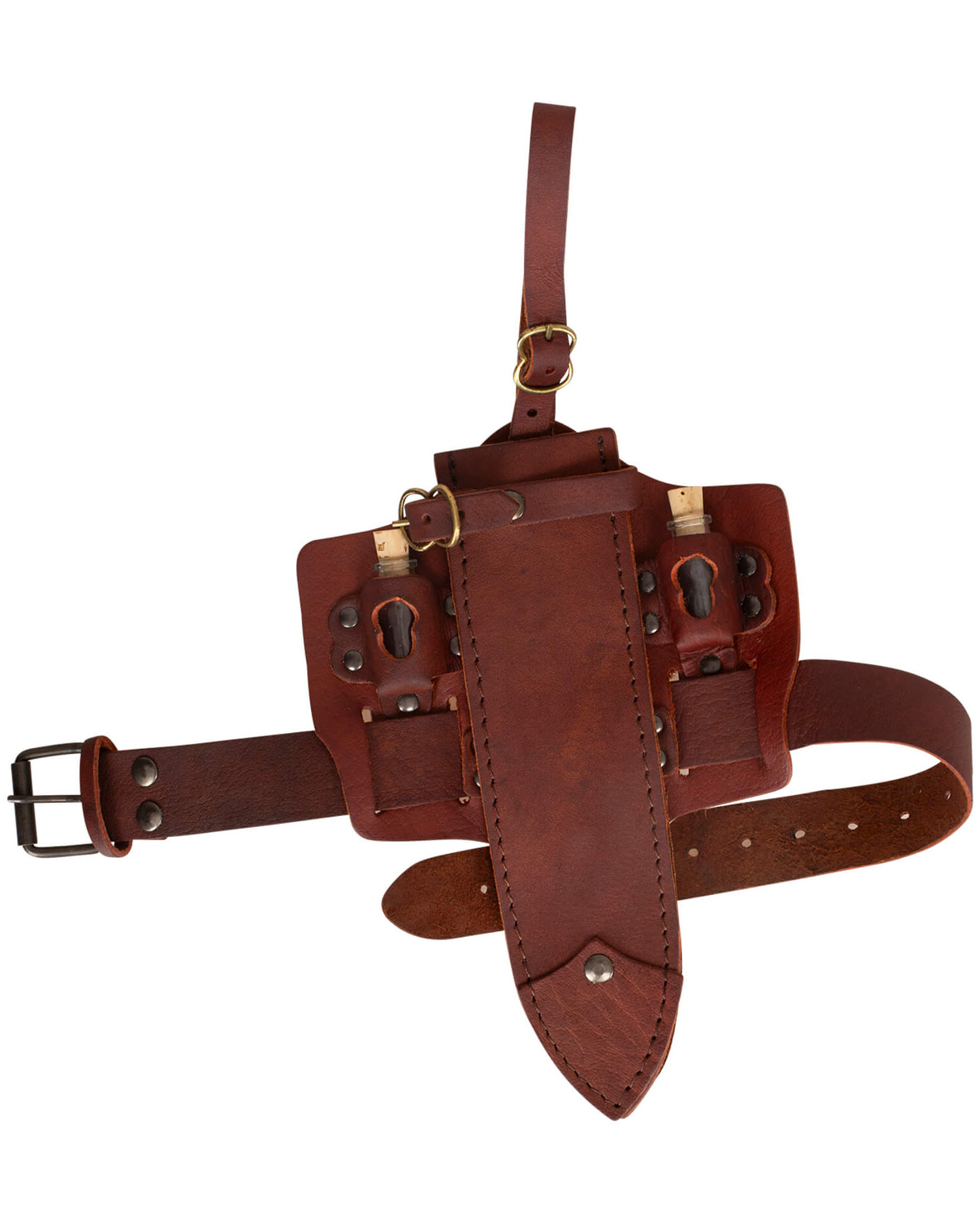 Made with high-quality materials such as leather, glass, and cork (in the vials), the Trinity holster is not only functional but also adds an authentic touch to your medieval wardrobe. Ideal for LARP events, medieval fairs, or any occasion where you want to stand out with a unique and practical outfit, this holster will become an indispensable companion in all your adventures.