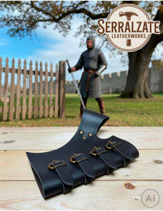 Are you looking for a sword holder that combines functionality and medieval style? This Jacan scabbard, made from high-quality black leather, offers a sturdy and adaptable solution for your adventures. Its design features four straps that allow precise adjustment for different sword thicknesses, ensuring a secure and comfortable grip at all times.