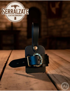 Its small and adjustable size makes it ideal for hanging from the belt, sword, or dagger, fitting perfectly to the thickness of the blade thanks to a strap with a buckle that allows you to adjust its width effortlessly. This ensures your weapons are securely held and easily accessible at all times.