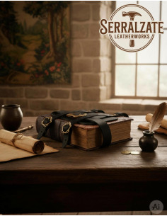 Are you looking for an accessory that combines functionality and style in your magical adventures or medieval reenactments? This black leather book holder offers the perfect solution to showcase an authentic and practical touch.