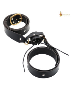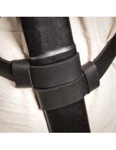 The design features a main strap and two shorter additional straps, practically designed to secure both swords and accessories or capes. The circular rivets and the golden oval buckle not only add visual character but also reinforce key points for secure fastening, allowing smooth movements without losing adjustment. The loops and holes make it easy to adapt to different outfits and postures without complications.