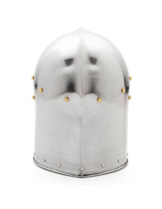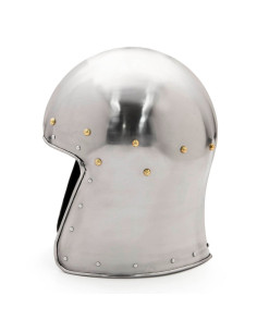 The medieval Barbuta-type helmet without visor, XV century is an excellent option for those looking to wear an authentic helmet from medieval times. Similar to a headpiece but without a visor, this helmet features a T-shaped opening for the face and side edges that cover the cheeks, providing optimal protection without compromising comfort.