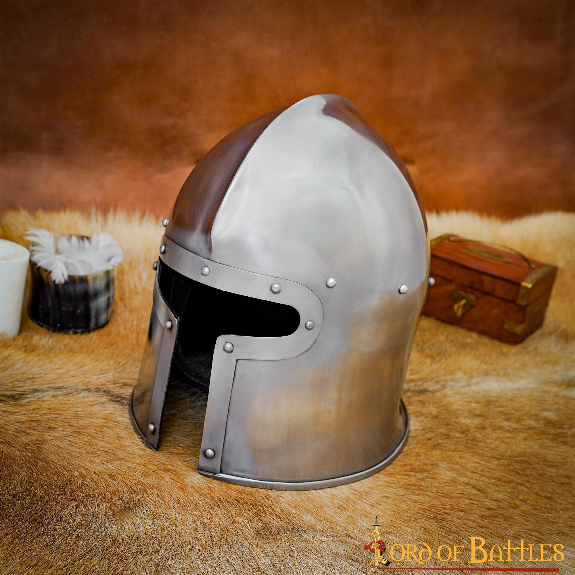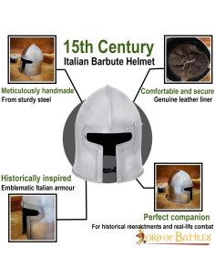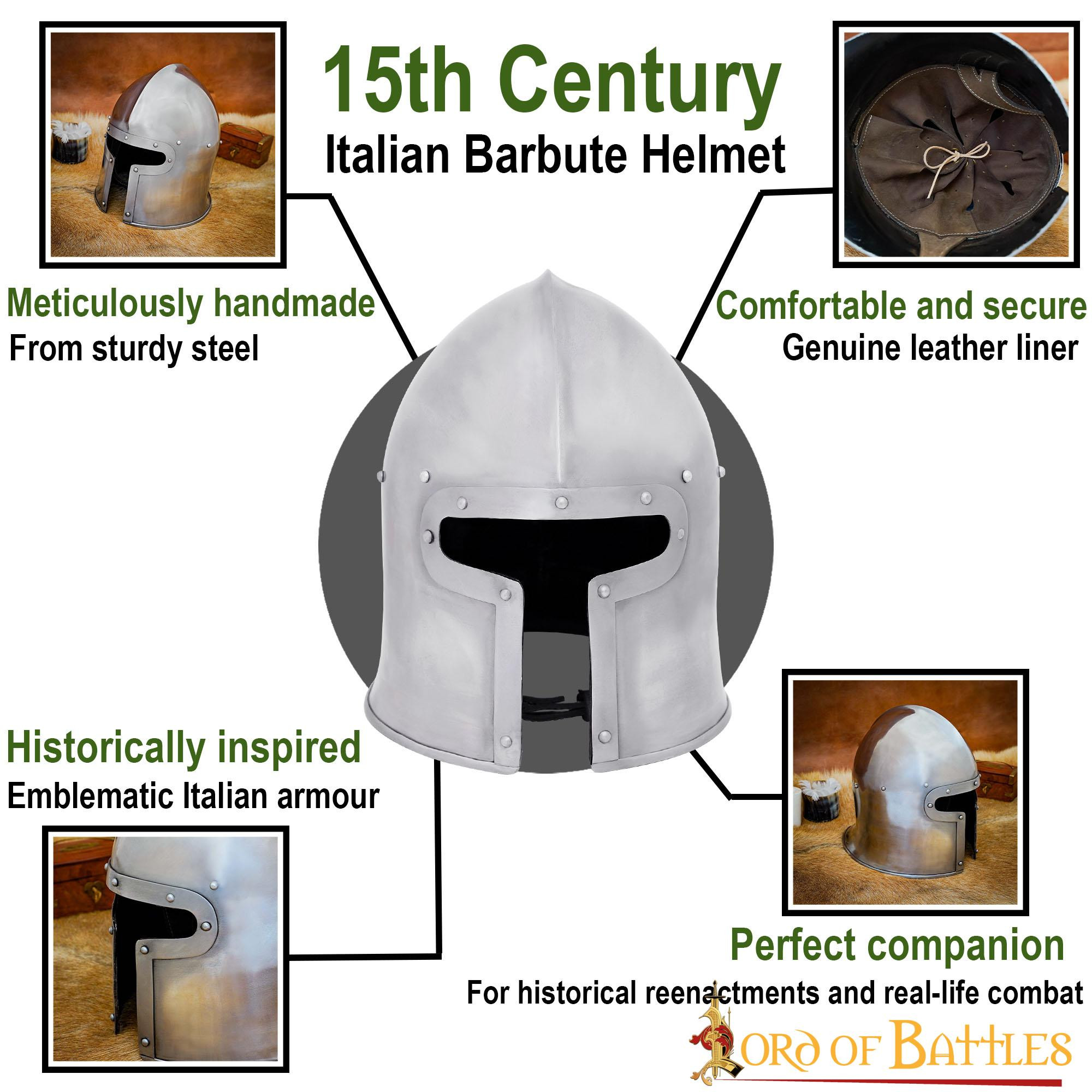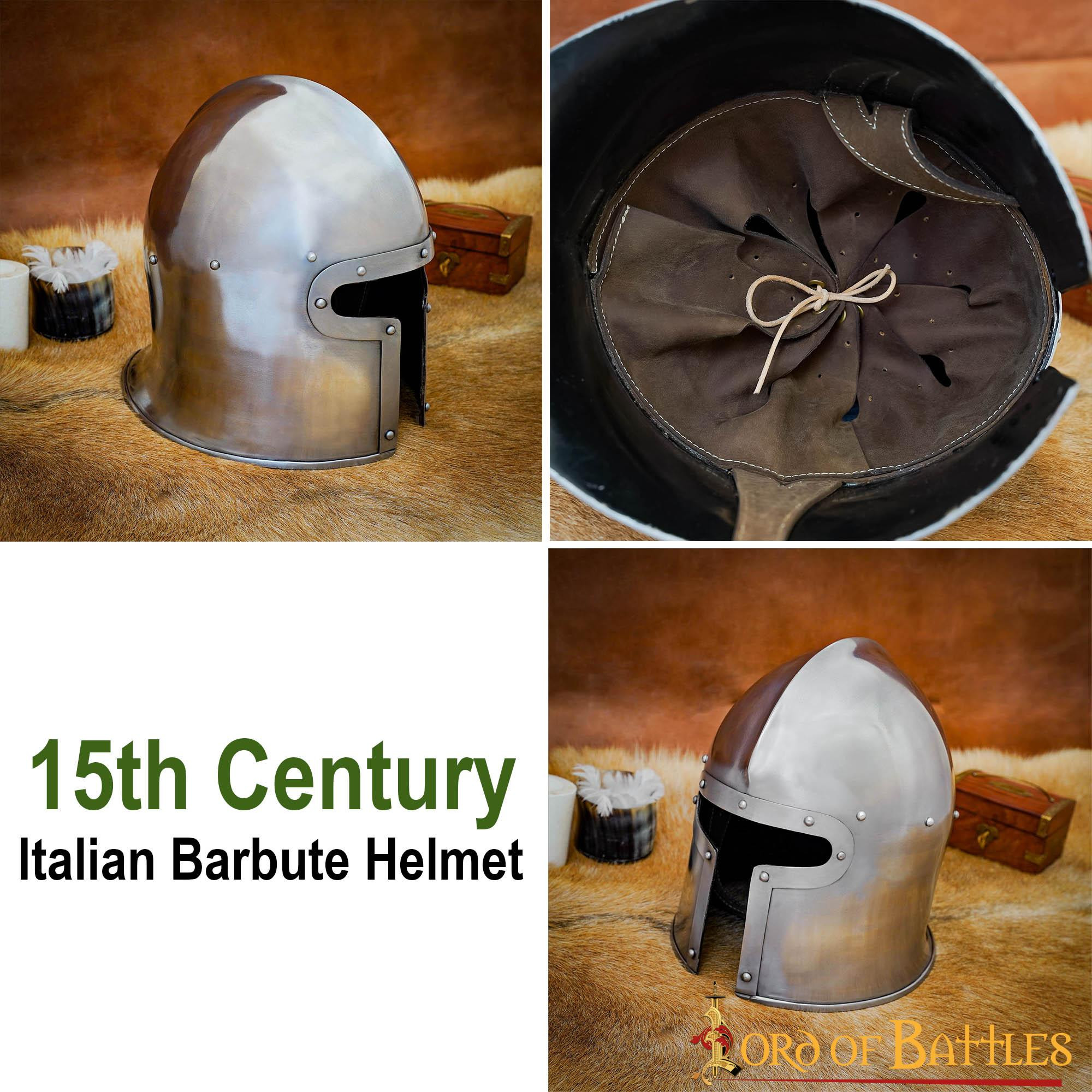 - Characteristic Barbuta Design: Characterized by its distinctive chin guard, typical of 15th century Italian helmets, it offers not only a unique appearance, but also greater facial protection.
