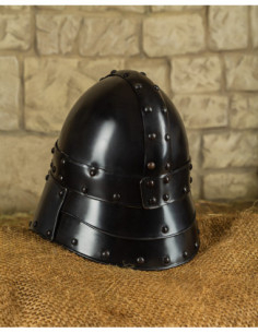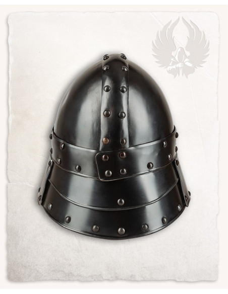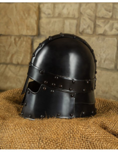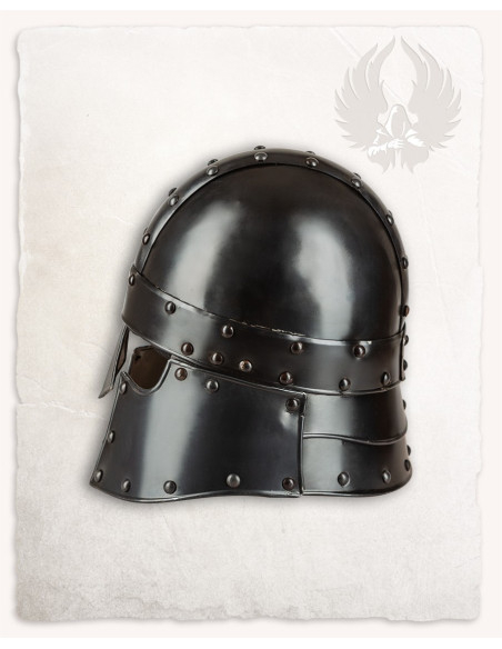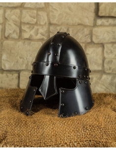 Inspired by late Roman riding helmets, this barbuta evokes the martial elegance of mounted units and adds that historical reference that enhances its appeal. If you are looking to buy Medieval Barbuta Halanor, Blackened Finish, you will discover a piece that combines an imposing appearance with well-thought-out protections, perfect for exhibitions, collections, and recreations where detail and presence matter.