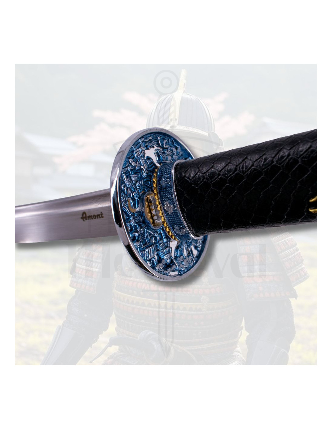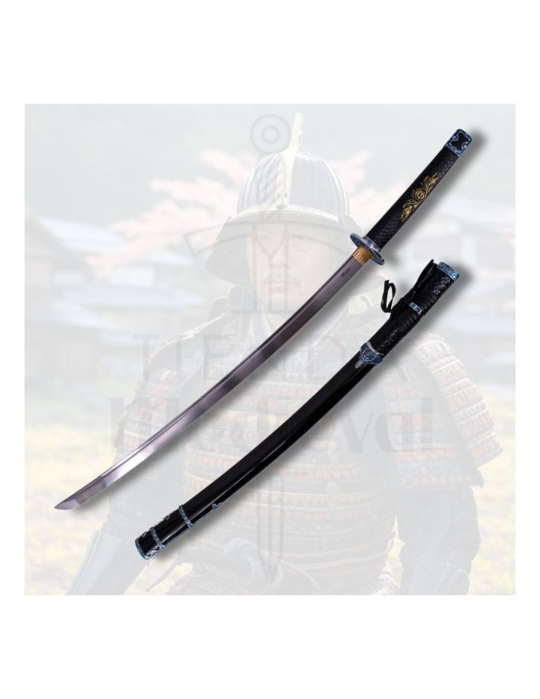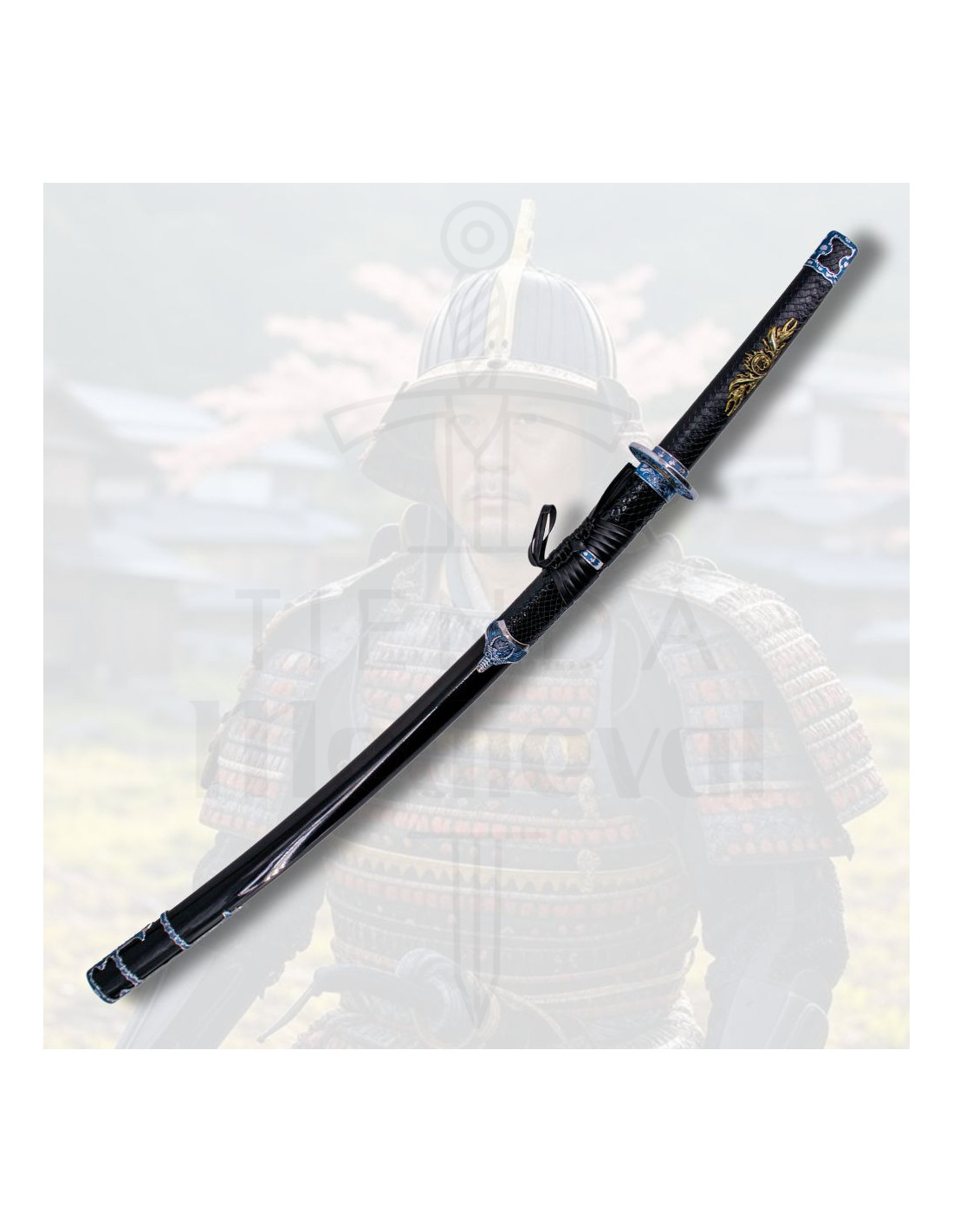The handle, wrapped in black synthetic leather with gold and blue details, provides a firm and comfortable grip, ensuring full control with every move. Its meticulous weaving and subtle snake skin imitations give it a distinctive and refined aesthetic. The black lacquered scabbard, decorated with bluish details resembling the texture of a snake, reinforces its elegant and powerful character.