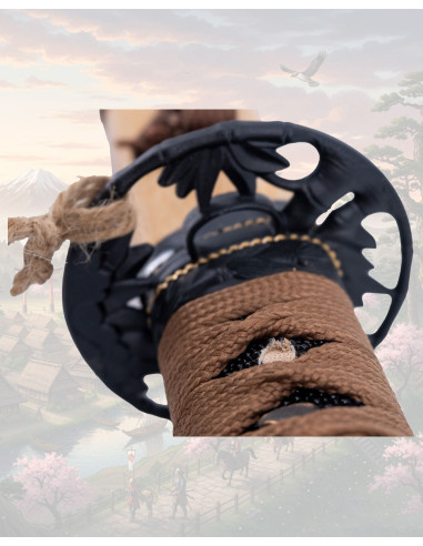 The scabbard, also in black with polished golden finishes at strategic points, complements the aesthetic and facilitates storage and presentation. The careful shine on the surface of the scabbard and the metallic details convey quality and make the sword stand out from different angles.
