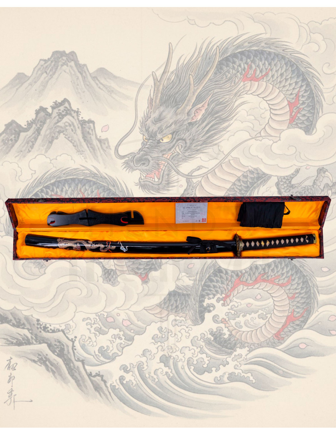 The lacquered black scabbard, decorated with a dragon in gold and red, makes the piece a perfect display object. The controlled shine of the lacquer and the golden details enhance any shelf or corner, while the upper suspension cord allows for easy and secure transport. Additionally, it comes with a stand designed to showcase the sword proudly, effortlessly.