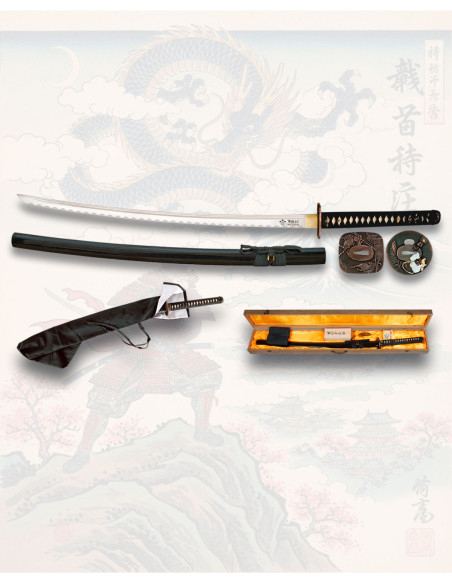 The smooth black sheath with cord and the included fabric bag make protected transportation easy, while the rigid wooden box with padded golden interior enhances its presentation, ideal for gifts or careful display. The accompanying kit, which includes a fabric sheath, tsuba set, and cleaning equipment, keeps the piece in optimal condition and ready to show off.