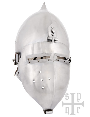 Ready to become an authentic medieval knight? This classic-style helmet, with its distinctive aerodynamic shape and onion-shaped top, will transport you straight to the Middle Ages. Made from approximately 2 mm thick steel, it offers solid protection without sacrificing comfort.