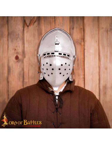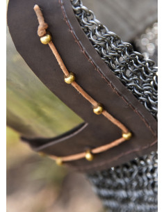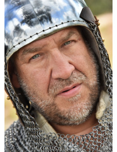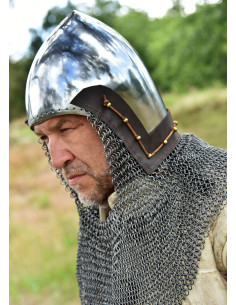 With a design that evokes the medieval era, this helmet with built-in executioner not only offers protection but projects strength and confidence. Its 2 mm thick steel structure guarantees a resistance that won't bend under blows, allowing you to act decisively. Its fit in sizes M and L ensures the helmet fits you perfectly, eliminating distractions while fighting. The adjustable padded liner provides a soft feel, ensuring comfort is not an issue in the heat of battle. The executioner, with flat rings and attached via eyelet pins and leather cord, offers additional protection for your neck, making every movement safe and confident. Everything about this helmet, from its materials to its design, works to ensure you live with the certainty that you are ready to face any challenge and conquer your goals with maximum intensity.