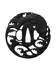 Hanwei's Koi Wakizashi features a stunning design with black and white mounting, black stingray skin grip, and a black iron tsuba with beautifully detailed koi. The antique finishes on the pieces give this wakizashi a well-cared, authentic look.