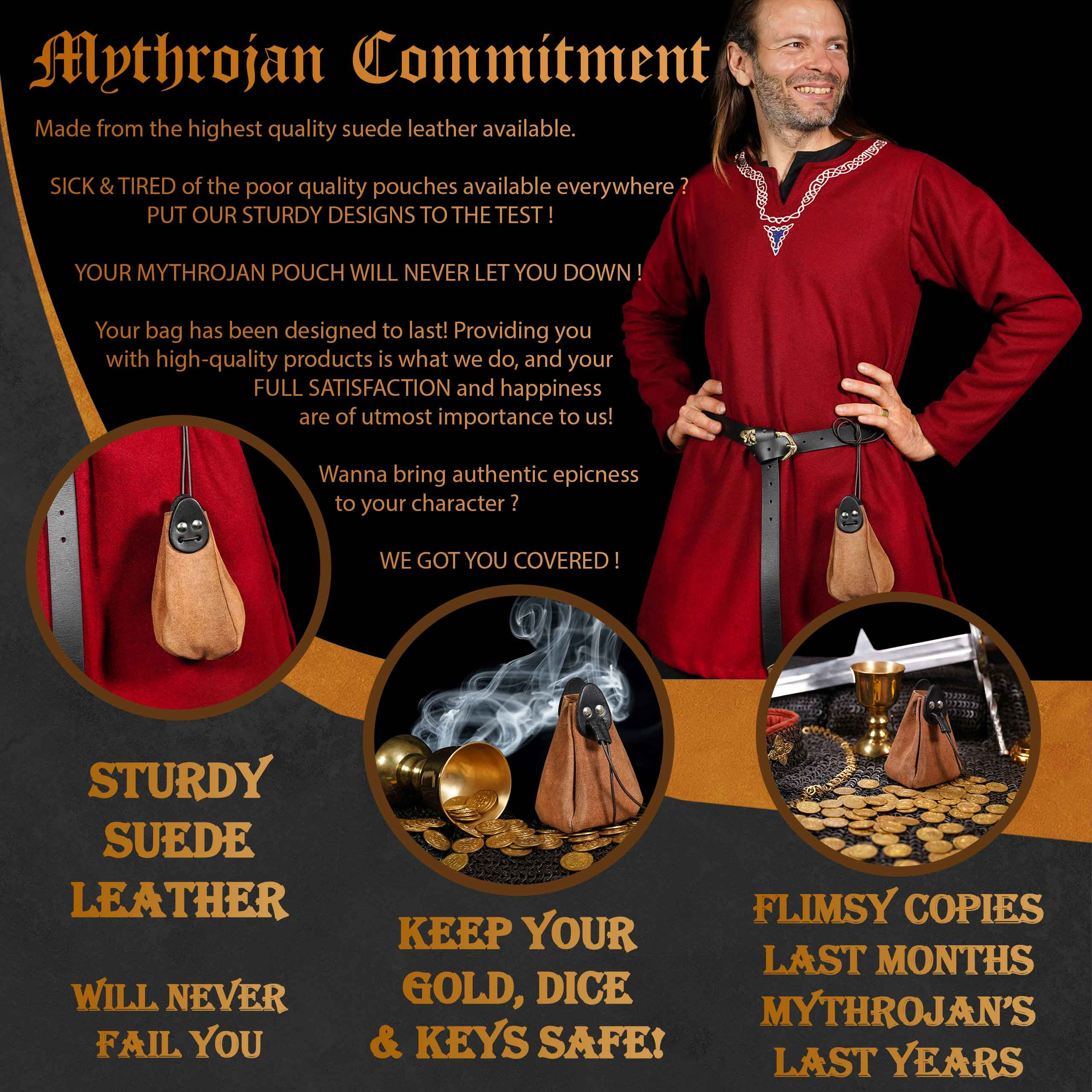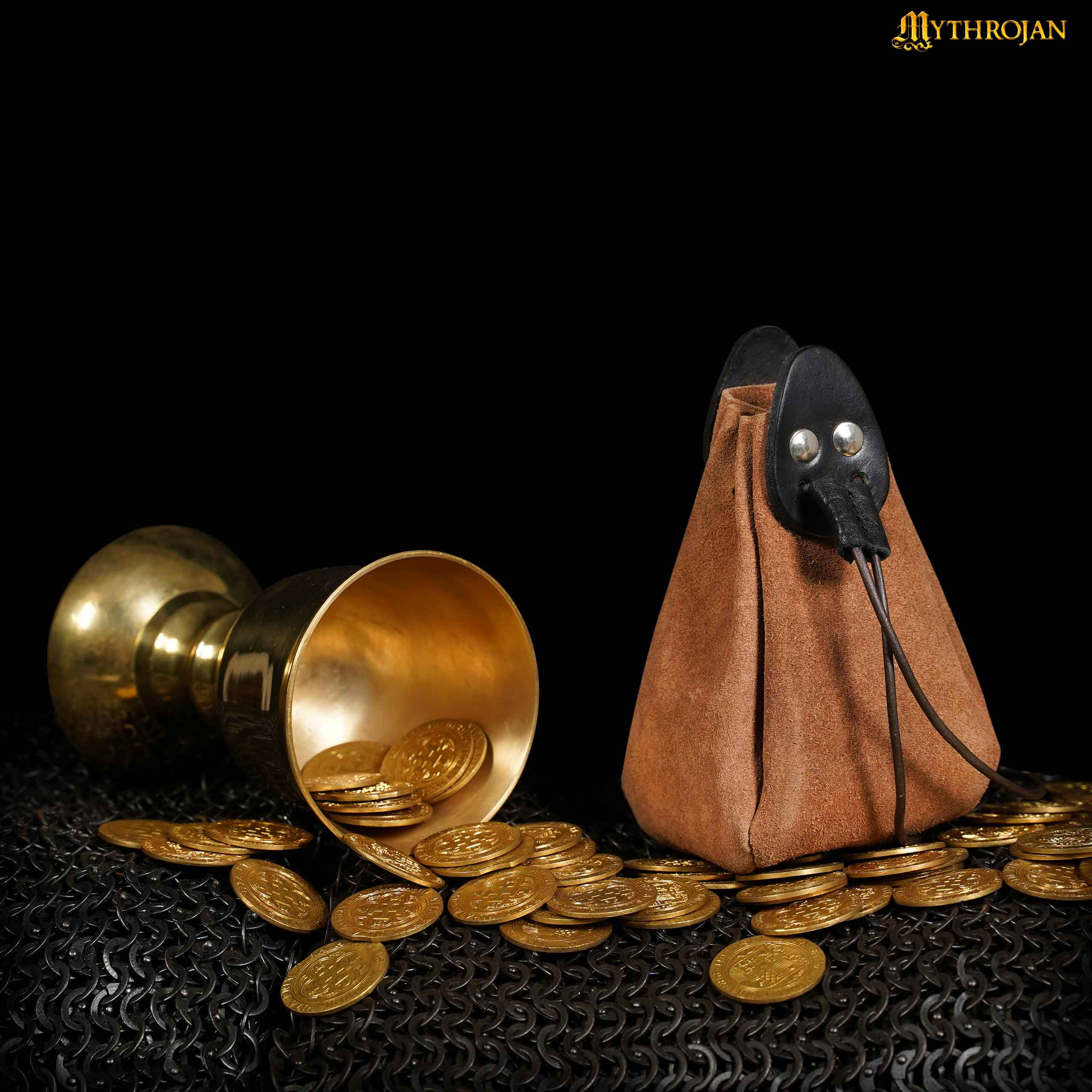 Immerse yourself in the medieval experience with our Mythrojan Brown and Black Leather Reenactment Bag. Imagine the scenario: you cross the fortified gate of the city, defiant under the gaze of the guards. You are a mercenary, a bold swordsman, and your purse is overflowing with gold and silver coins won in battle. You proudly adjust your cloak, knowing that you will soon display a newly acquired sword that will leave everyone speechless.