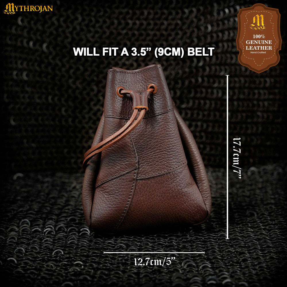 Discover the perfect combination of functionality, durability, and style with this medieval leather purse in brown, ideal for complementing your outfit or for everyday use. Handmade by the renowned brand Mythrojan, this piece has been crafted from high-quality full-grain leather, cut and worked artisanally with an exceptional level of detail. Its robust texture and attractive design guarantee unparalleled resistance, staying true to the commitment to quality that Mythrojan has perfected over years of work in the film industry.