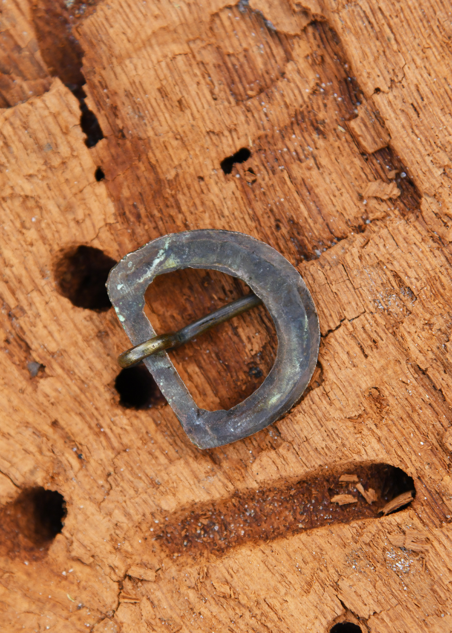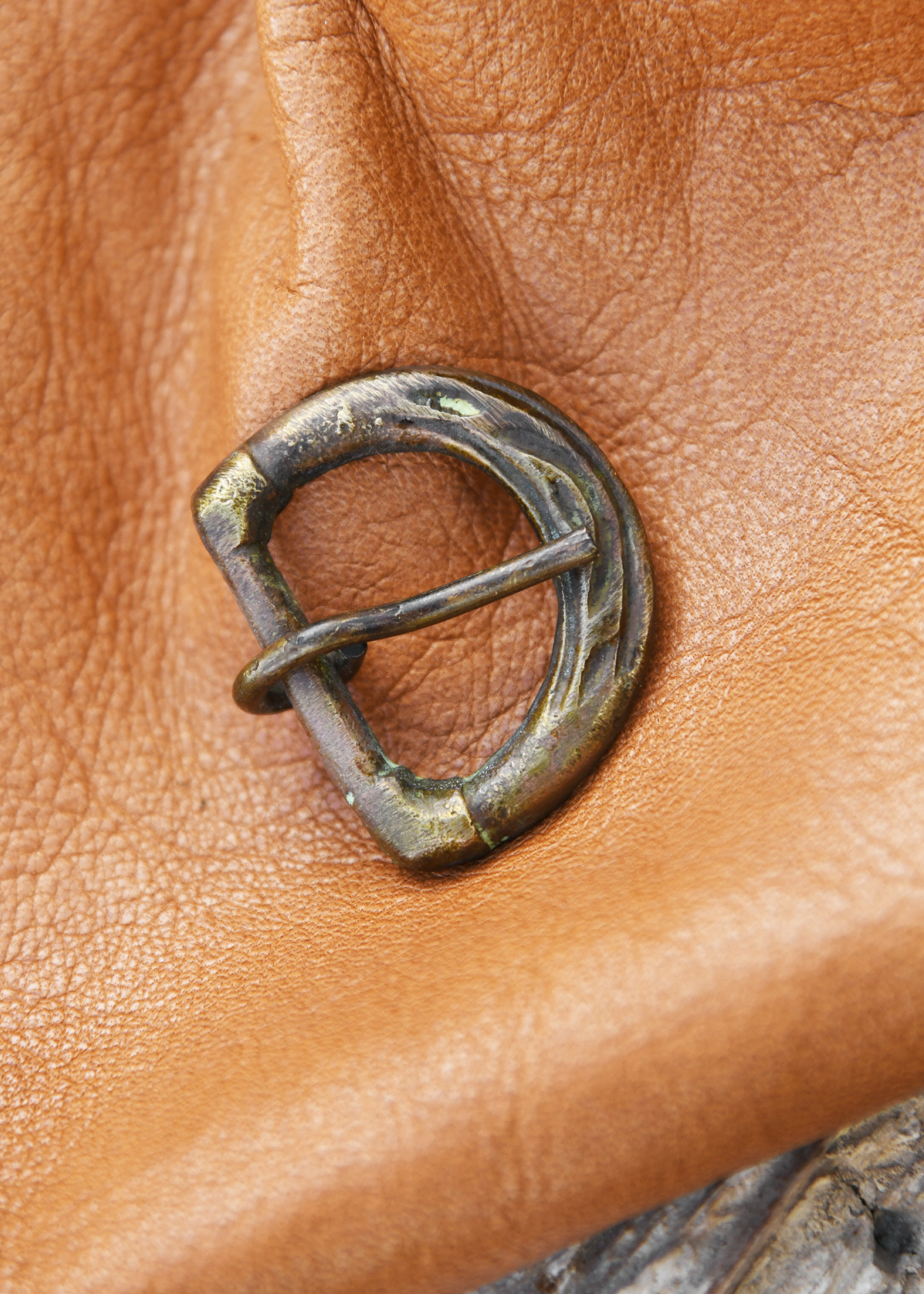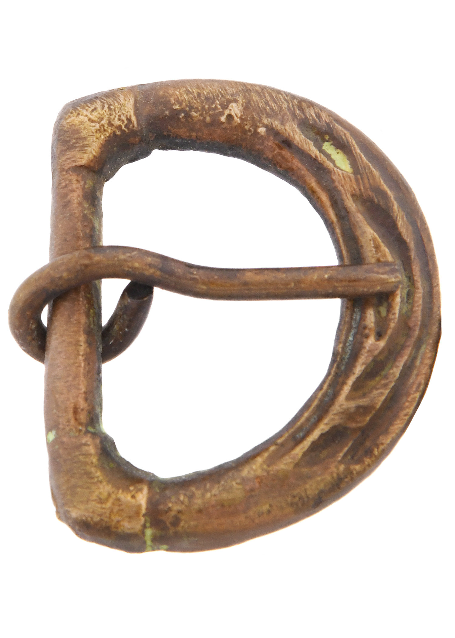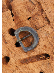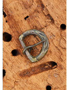 Made of brass with an aged finish, this replica of a late Medieval belt buckle stands out for its noble and durable appearance. The textured surface, with lines and decorative details, gives it a unique character, as if it had been found in an archaeological excavation. Its classic 'D' shape is ideal for belts up to 24 mm wide, ensuring a firm and lasting fit.