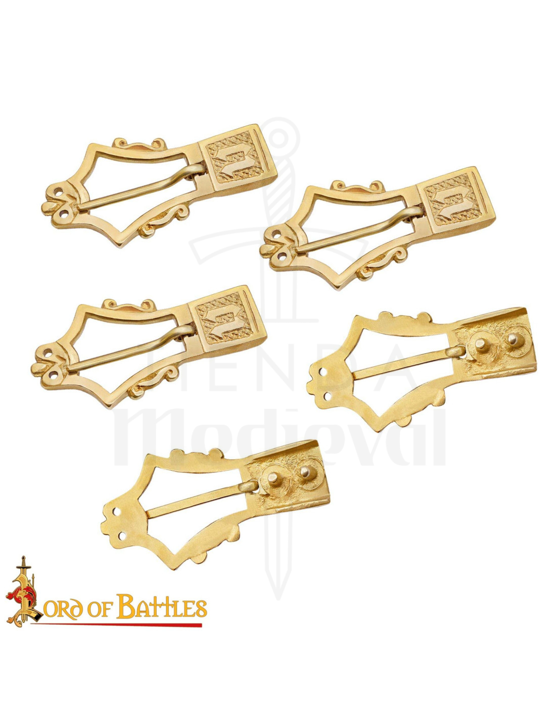 Visual details like the golden finish, ornamental reliefs, and spiral shapes create an immediate aesthetic impact. Purchase-oriented keywords like "buy Set of 5 Authentic Brass Lyre Buckles in Medieval Style" perfectly describe what you'll find here, no frills.