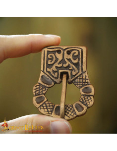 The geometric motifs and embossed patterns give it a handcrafted character, as if each piece had been shaped by expert hands. When combined with a brown leather base and light fur details, the buckle gains a contrast that underscores its rustic and elegant personality at the same time.