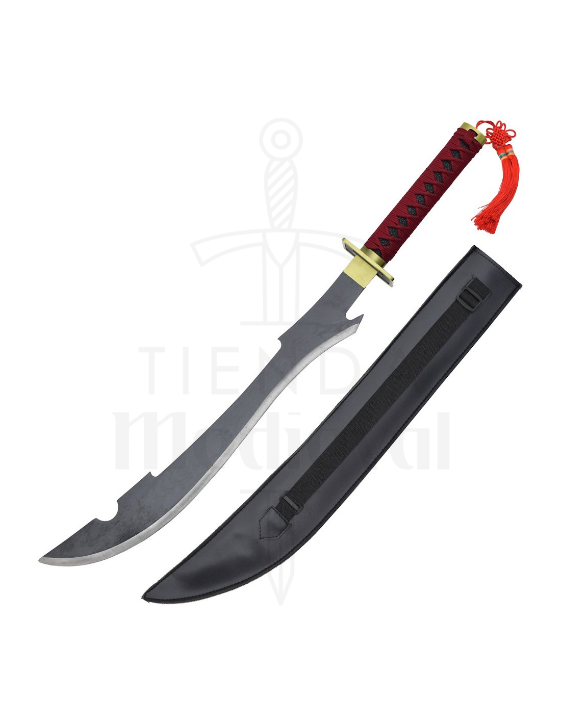 The black synthetic leather scabbard includes an adjustable strap with a buckle that secures the sword during transport, preventing movement and protecting the finish. The robust and compact machete-style design facilitates carrying it to conventions or photo shoots without complications.