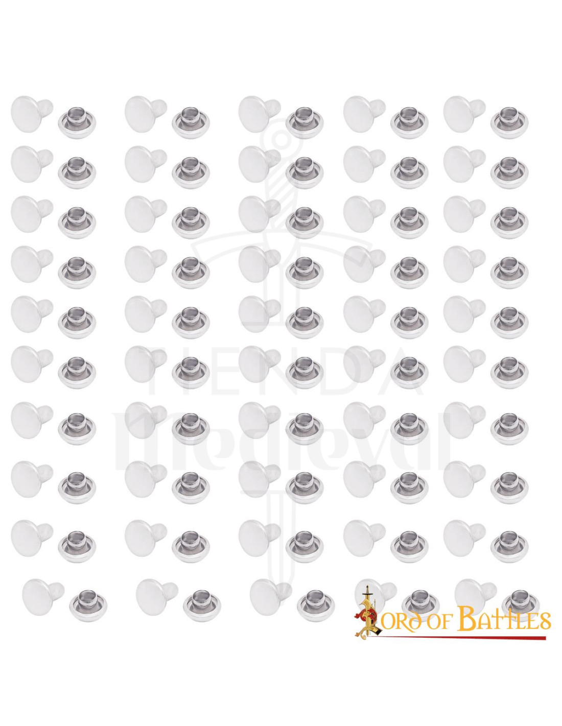 This Pack of 50 Medieval Decorative Steel Rivets 7mm offers the perfect balance between aesthetics and functionality, allowing you to customize clothing, accessories, and leather projects with a neat and durable finish. The silver finish adds a subtle shine that enhances fabrics and materials, while the round and smooth head maintains an elegant and versatile look, ideal if you are looking for a subdued yet distinctive appearance.