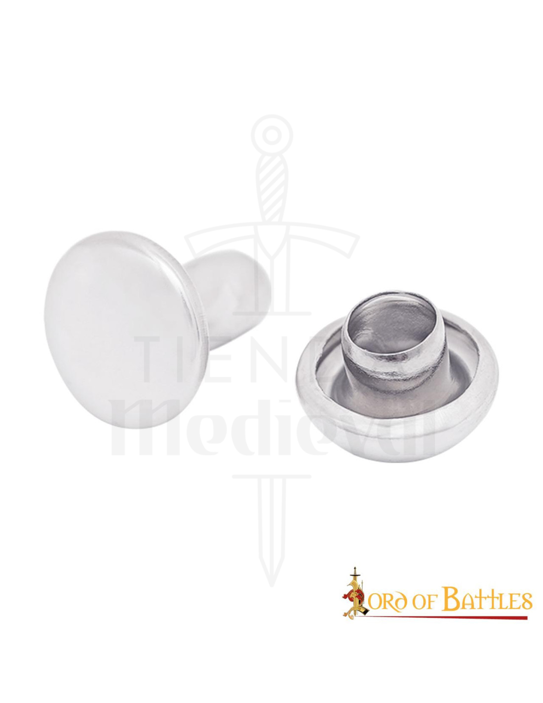 If you want to buy the Pack of 50 Medieval Decorative Steel Rivets 7mm, you are choosing a practical solution that enhances the presentation and durability of your works while boosting your creativity. The image shows a pair of round metallic rivets, clearly visualizing how both pieces fit together and how they look on the material, helping you imagine the final result before placing them.