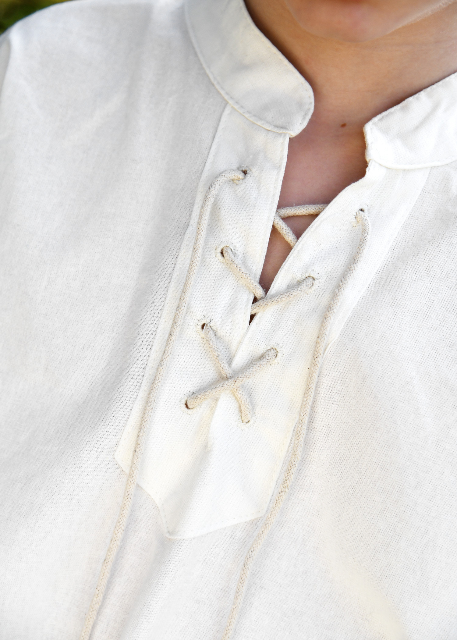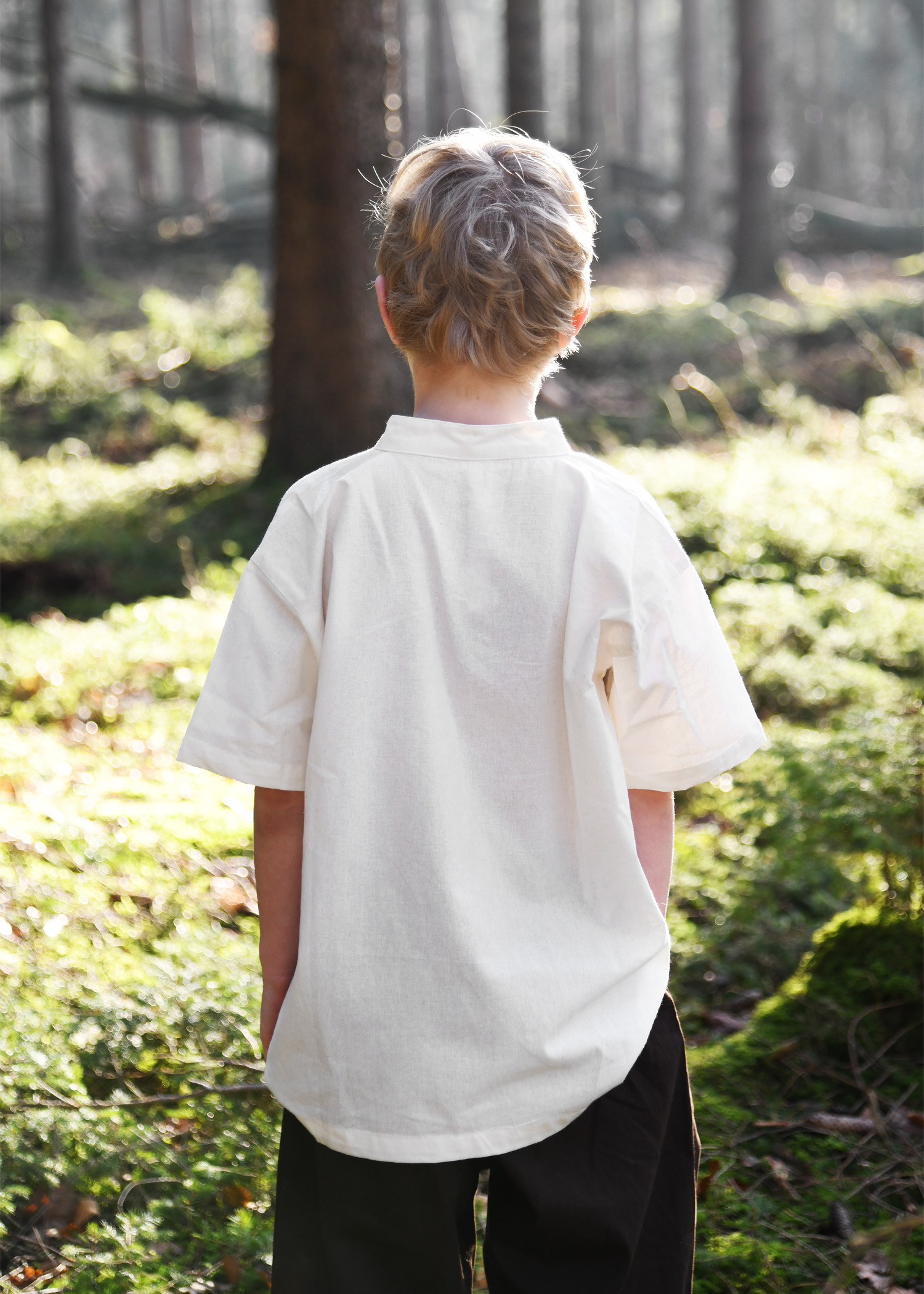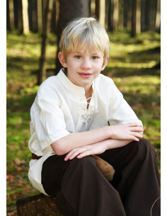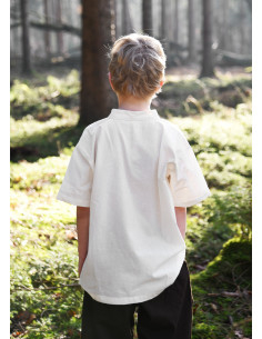 This medieval shirt for children, with a straight cut, is a classic in medieval clothing and is versatile in its use. With short sleeves, it is perfect for summer, whether as a pirate, squire or knight's shirt. It is made with a fine cotton fabric that provides comfort when wearing it. It has a high neck and laces at the neckline.