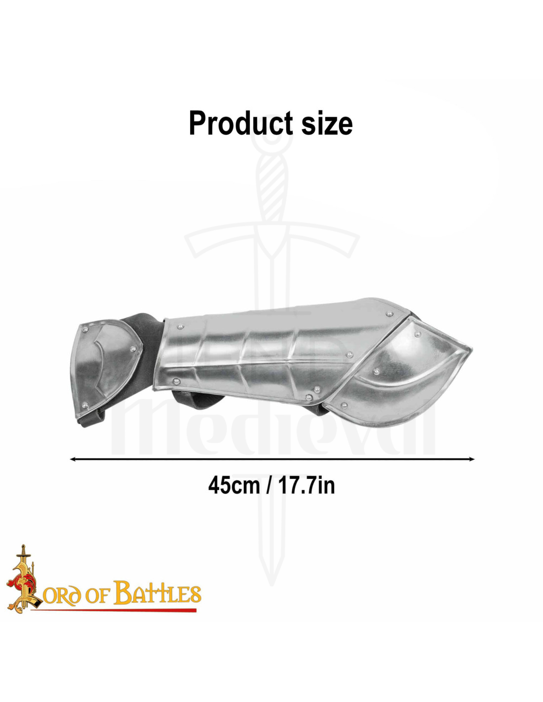 These arm guards combine a polished silver finish with articulated plates, resulting in an elegant presence and natural mobility that enables you to attack, dodge, and gesture without restrictions. The segmented design acts like a second skin, protecting from the upper forearm to the wrist and part of the hand, while reinforcements in critical areas safeguard the joints without hindering your pace.