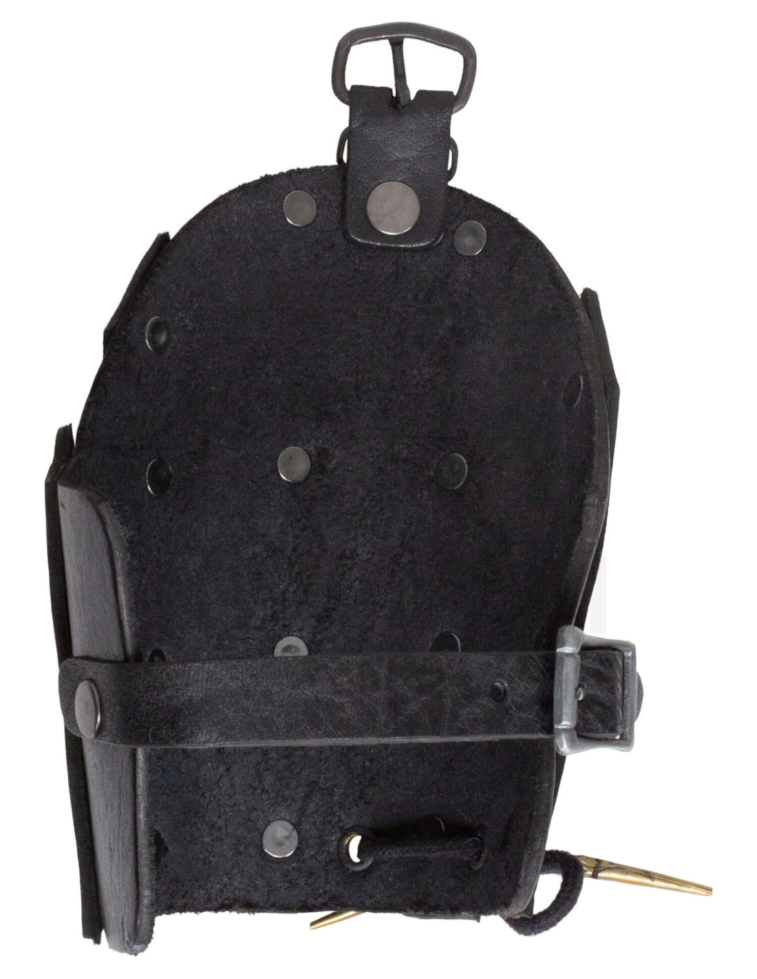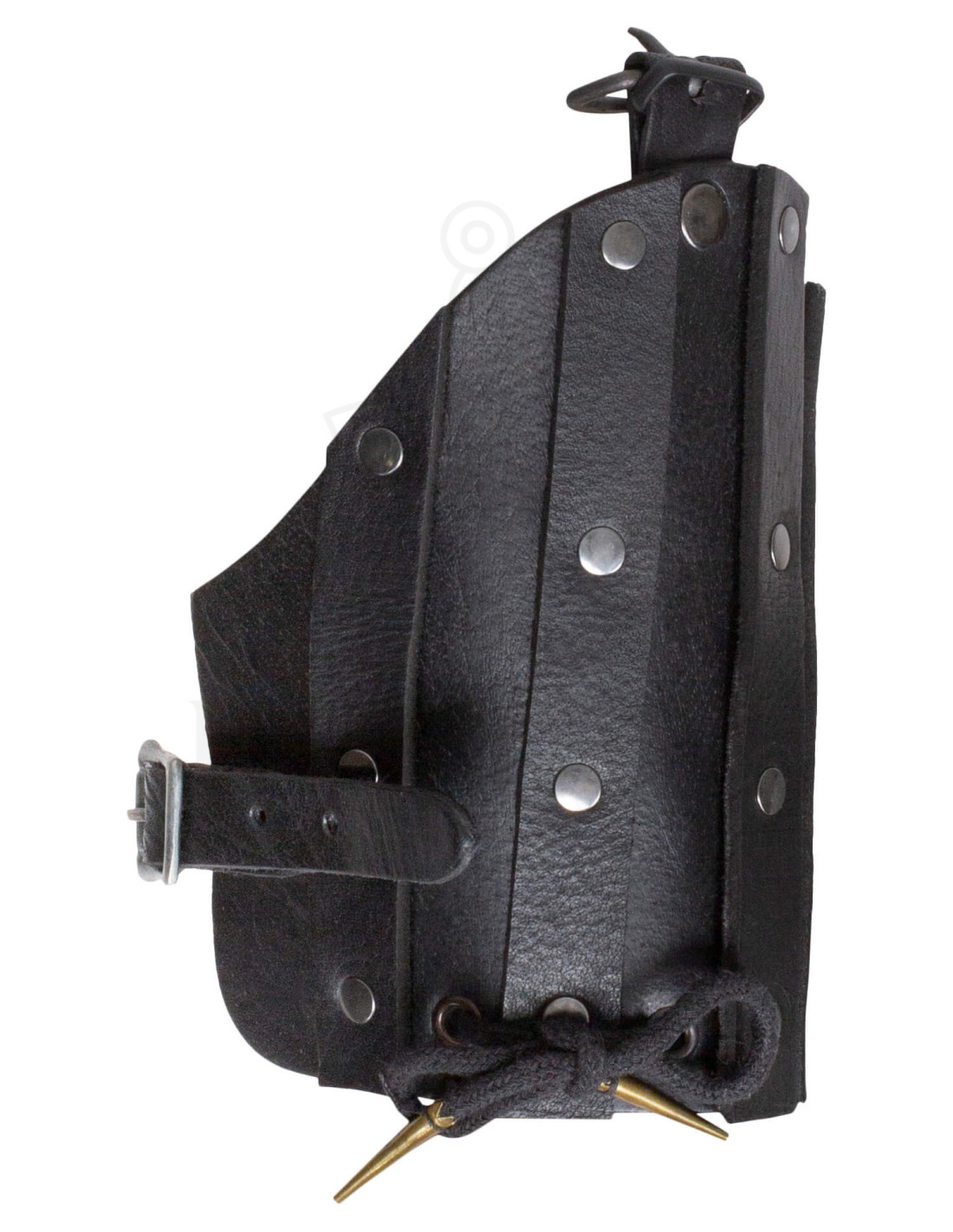 Visually, it highlights the black leather worked into strips, evenly distributed silver rivets, and the metallic details in the buckle and cord tip, giving it a robust and authentic look. This finish not only protects but also completes and elevates any character or costume concept.