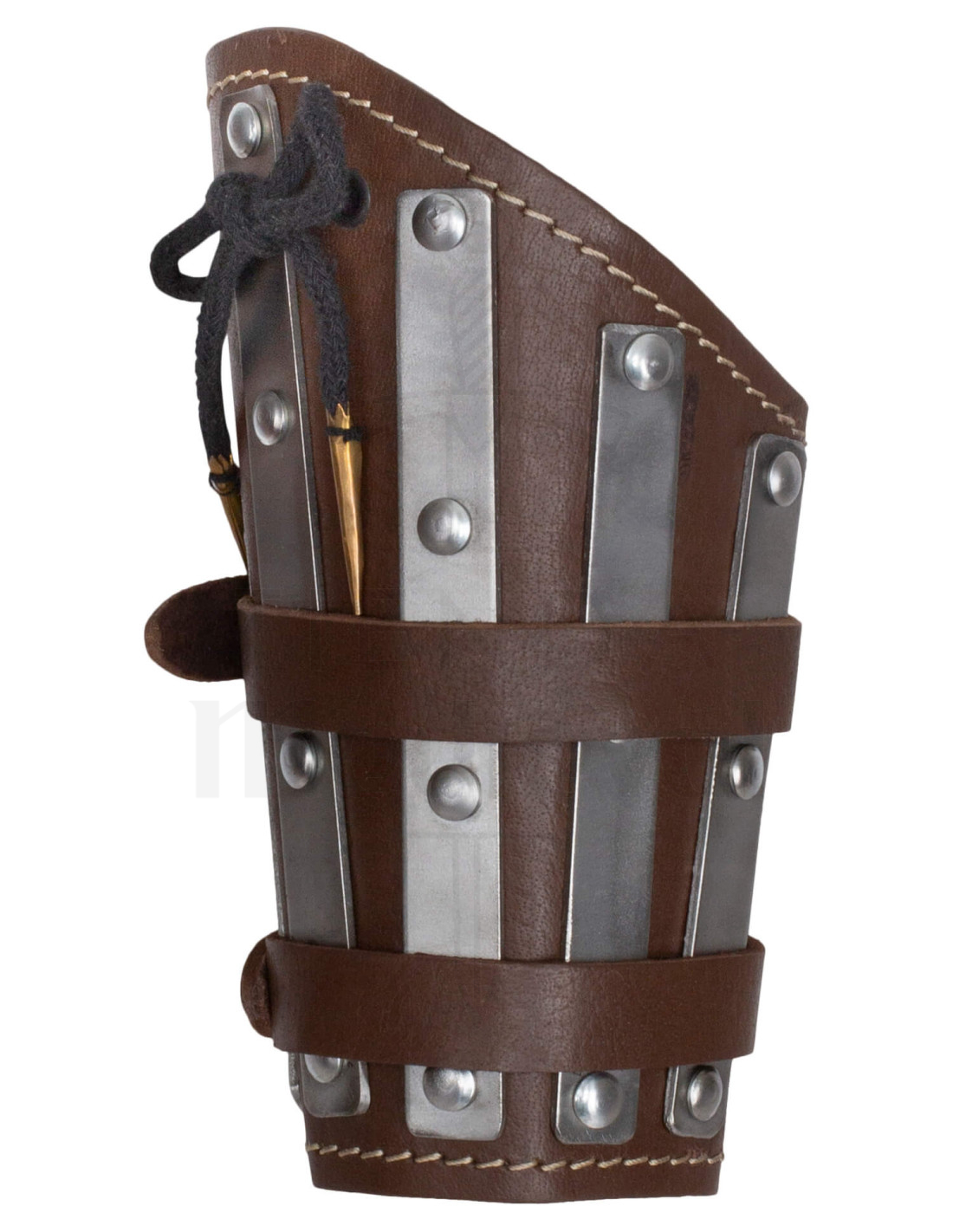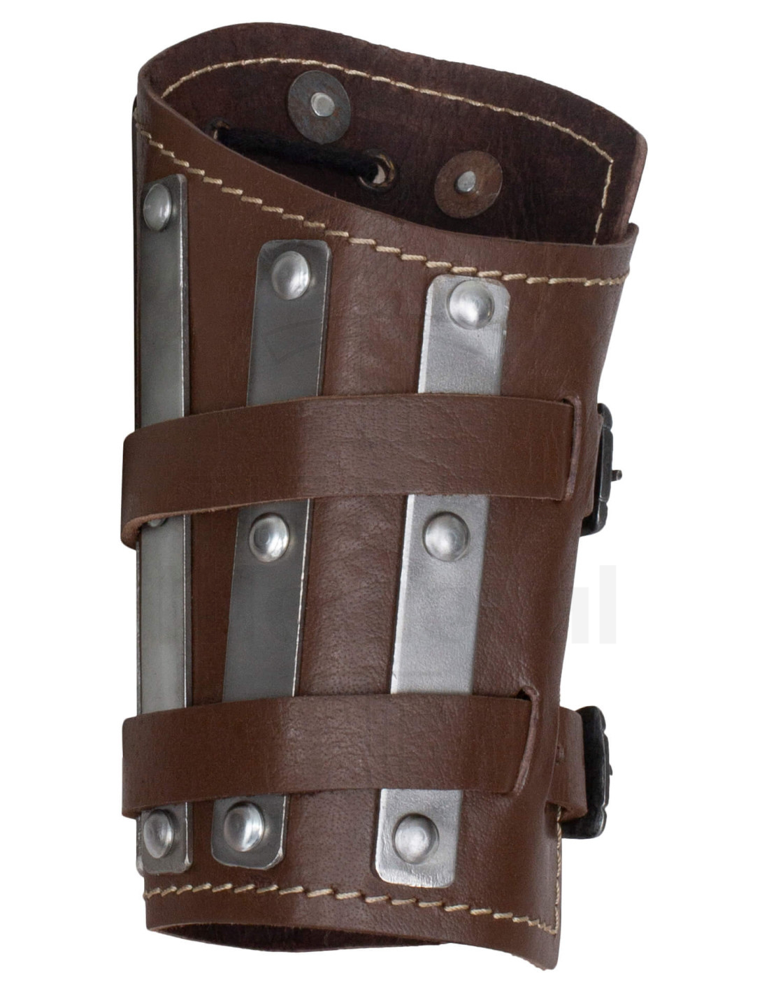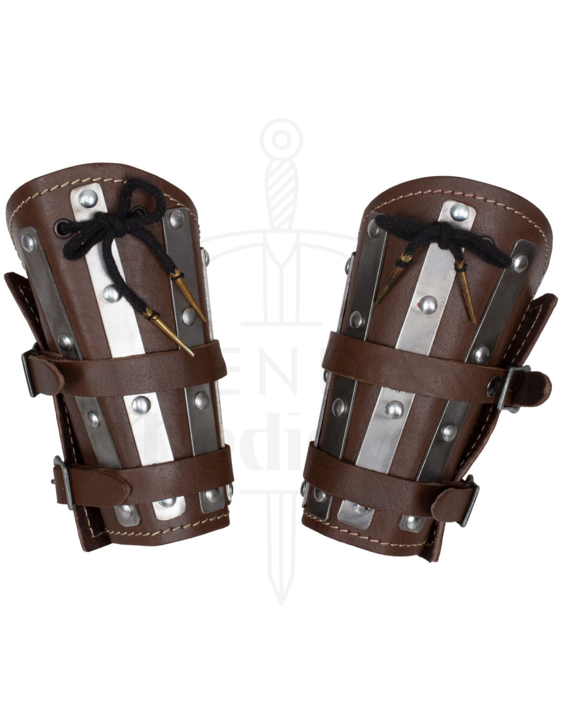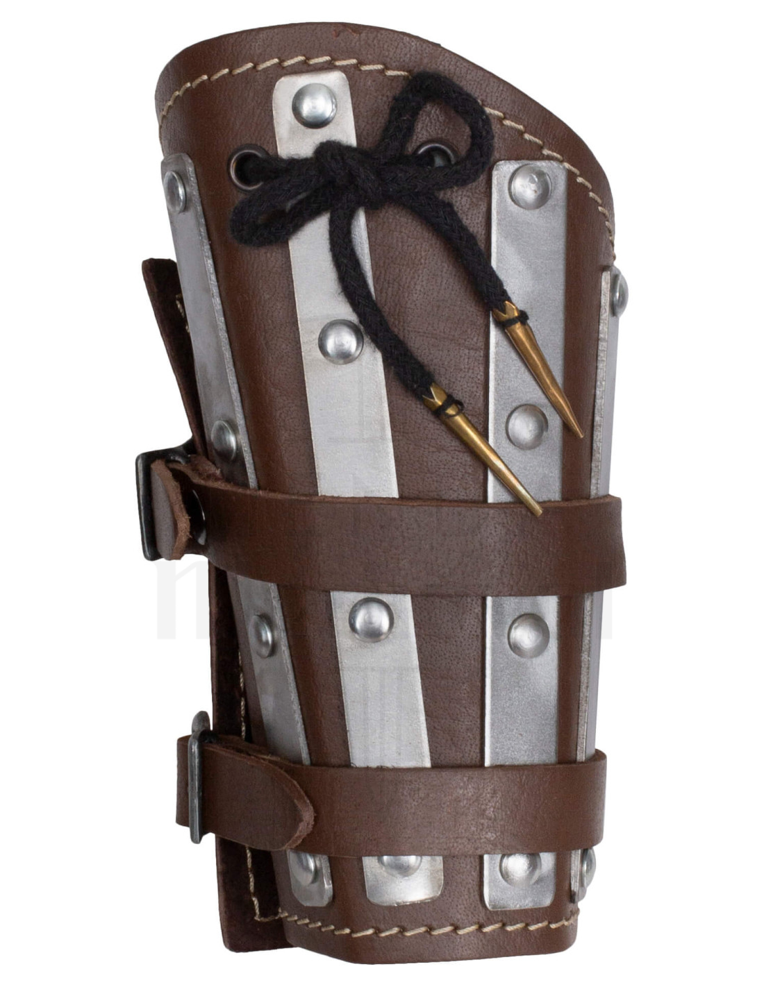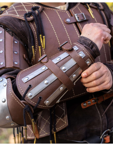 The brown leather, with a rugged appearance and careful finishes, provides a tough and authentic presence that enhances any staging or reenactment. The vertically placed metal reinforcements act as a barrier against blows, while their elongated design follows the natural movement of your forearm, allowing you to turn and act without feeling restricted.