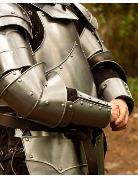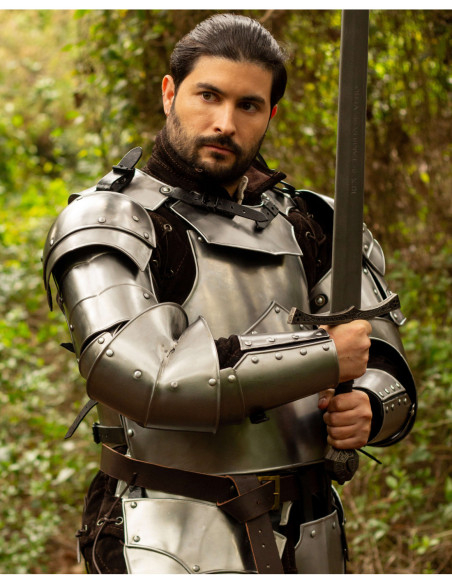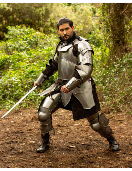 The set adapts to protection transformations, allowing assembly as a single plate or modular configurations according to the moment's needs, providing maneuvering freedom or increased coverage when it’s time to fight in the front line. The image showcases assembly details with rivets, hinges that enhance mobility, and adjustable straps, demonstrating a construction designed to last and provide a secure grip in all types of historical or recreational activities.